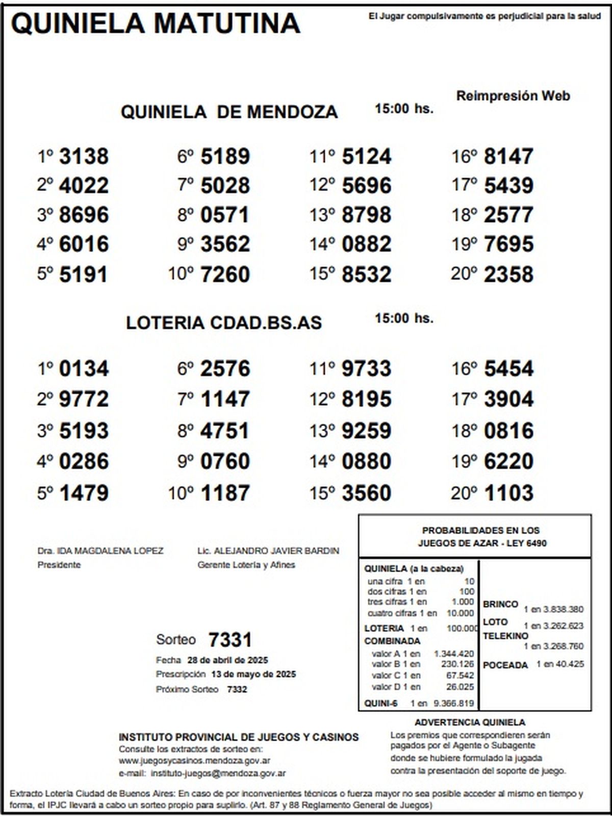 Resultados Quiniela de Mendoza: La Matutina del 28 de abril de 2025
