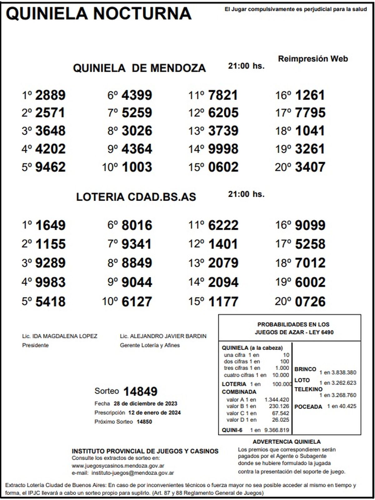 Quiniela de Mendoza: resultados de la Nocturna de hoy, 28 de diciembre de 2023