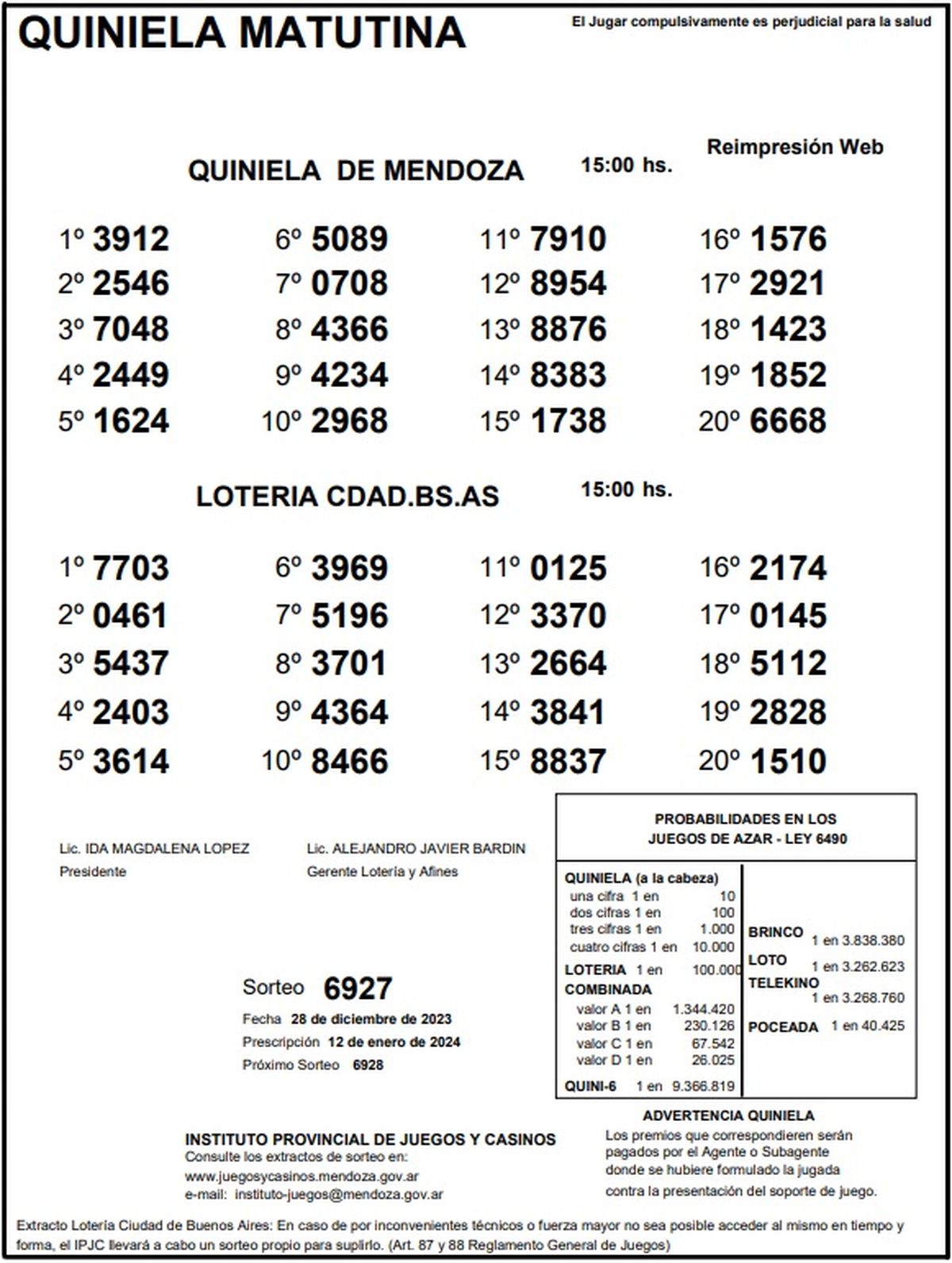 Resultados Quiniela de Mendoza: La Matutina del 28 de diciembre 2023