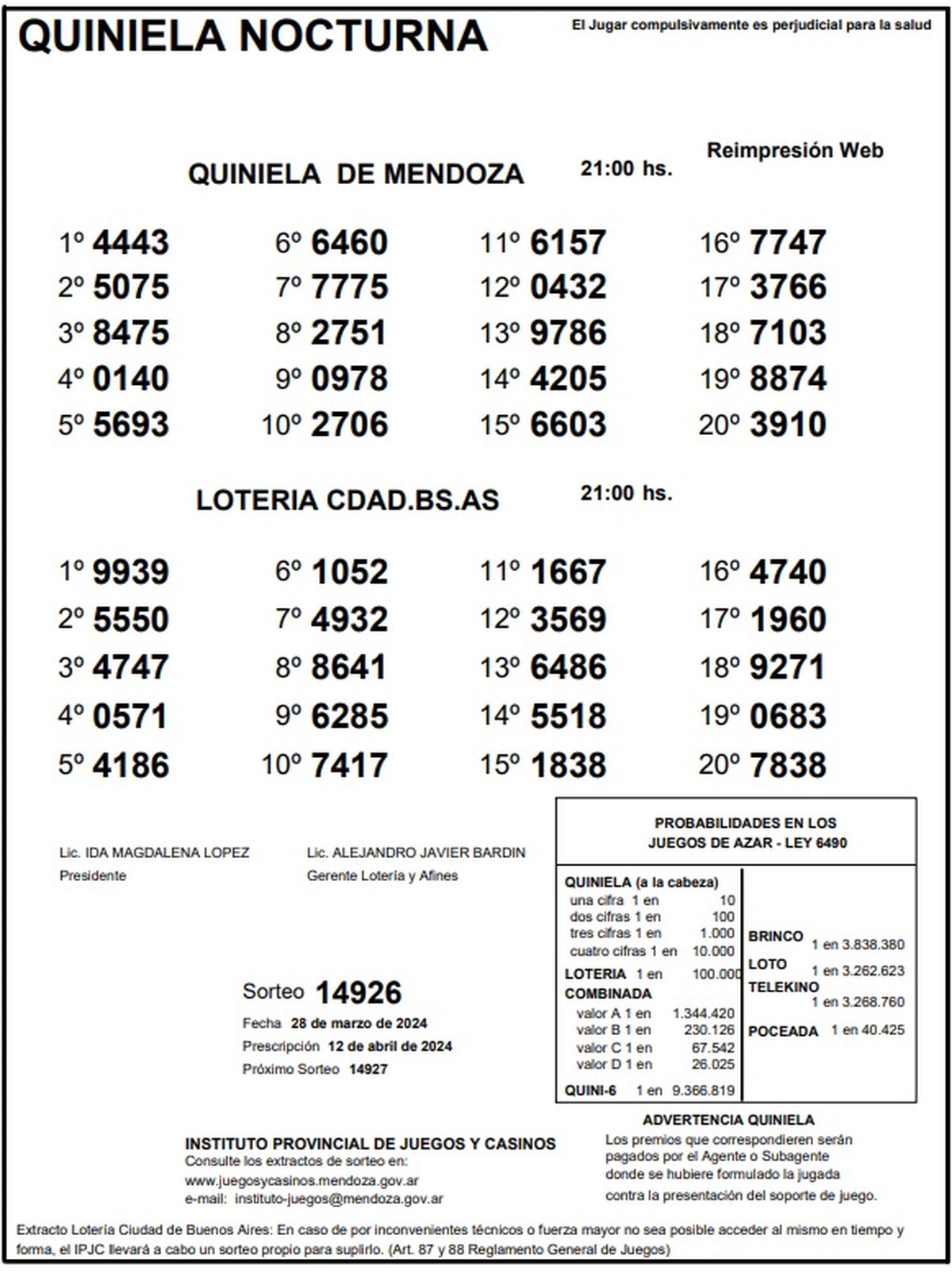 Quiniela de Mendoza: resultados de la Nocturna de hoy, 28 de marzo de 2024