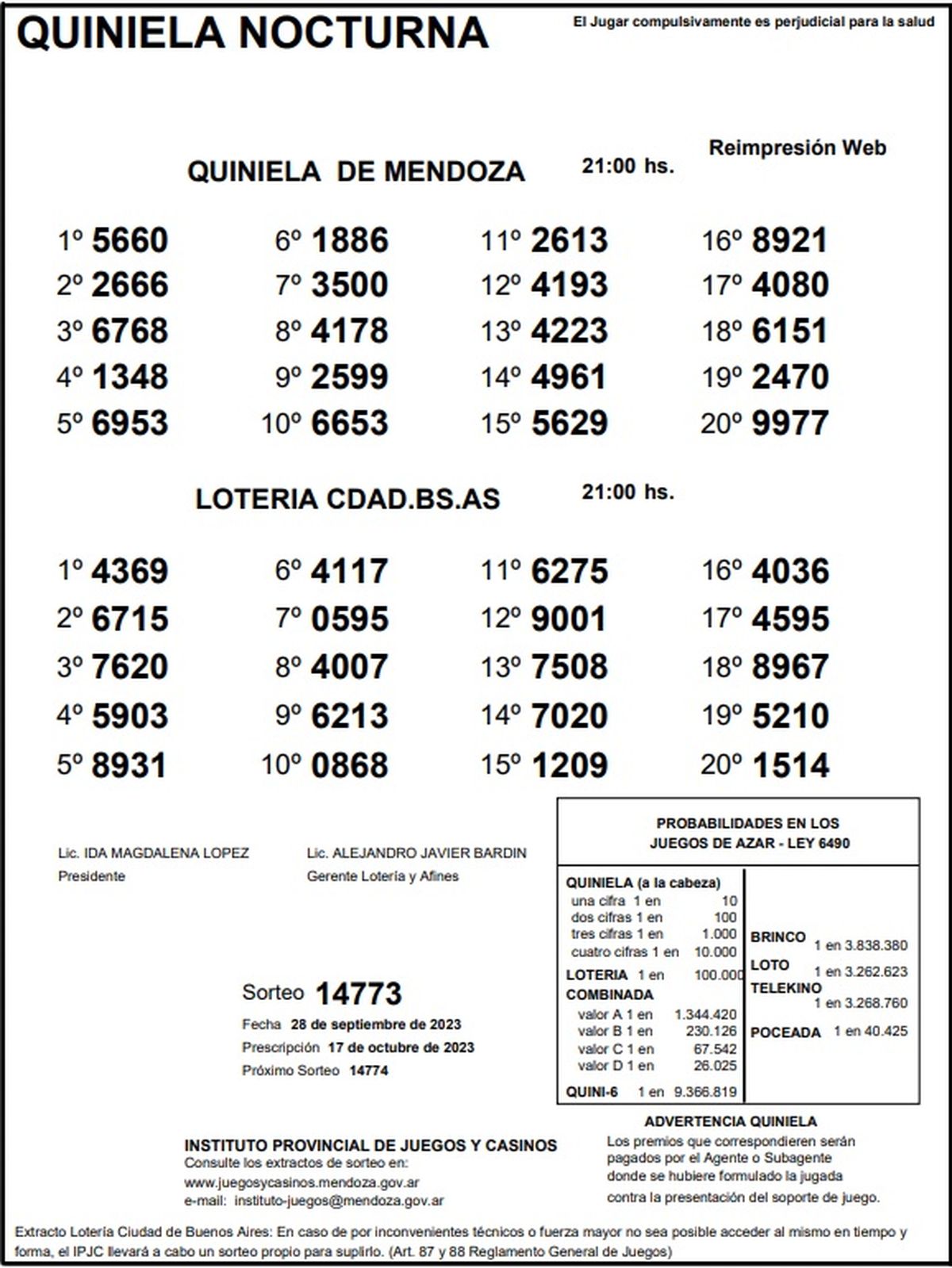 Quiniela de Mendoza: resultados de la Nocturna de hoy, 28 de setiembre de 2023