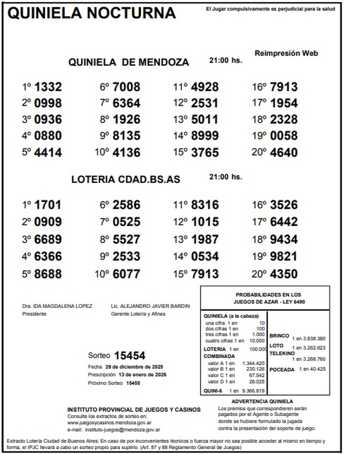 Quiniela de Mendoza: resultados de la Nocturna de hoy, 29 de diciembre.