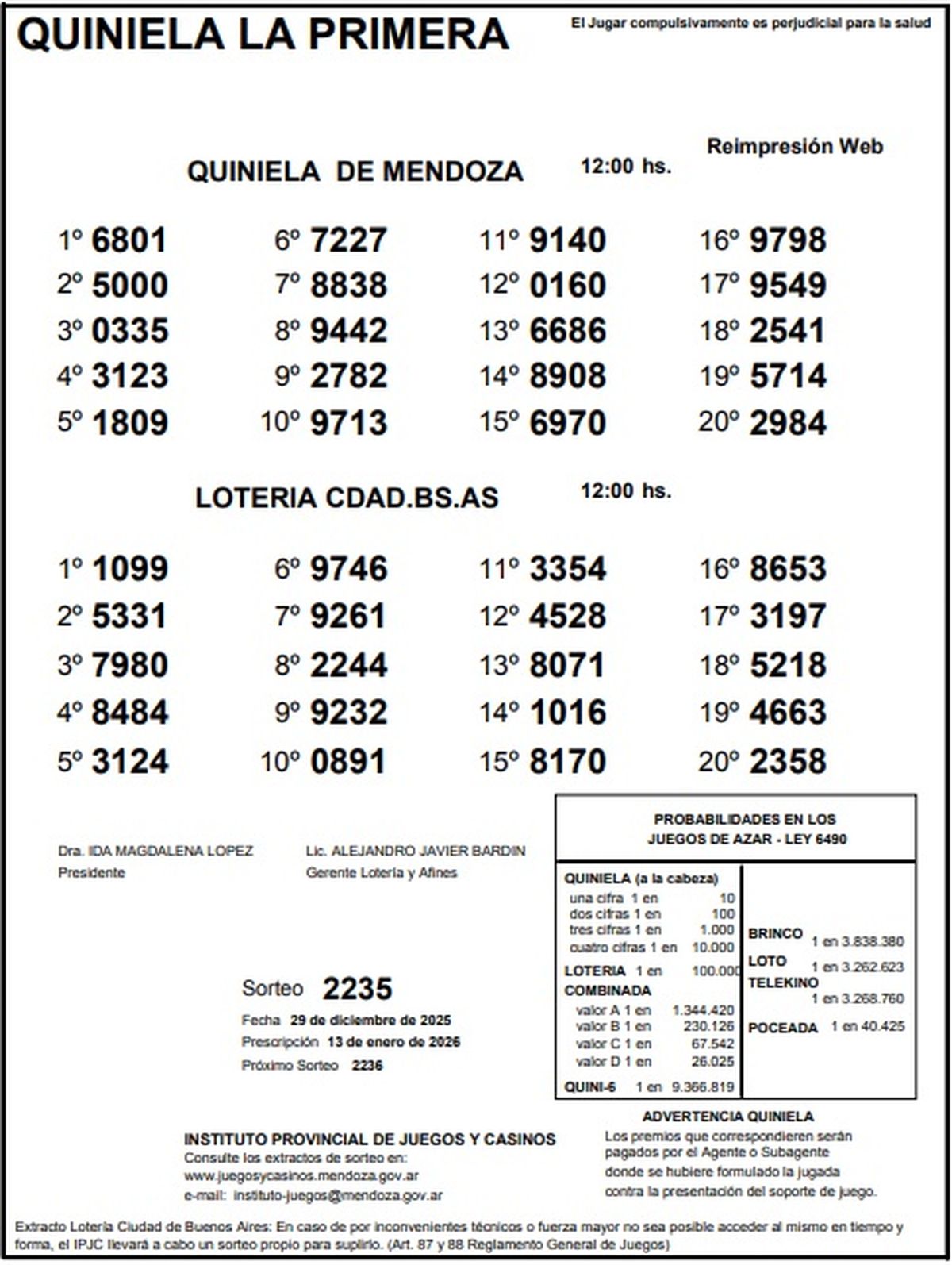 Resultados Quiniela de Mendoza: La Primera del 29 de diciembre de 2025