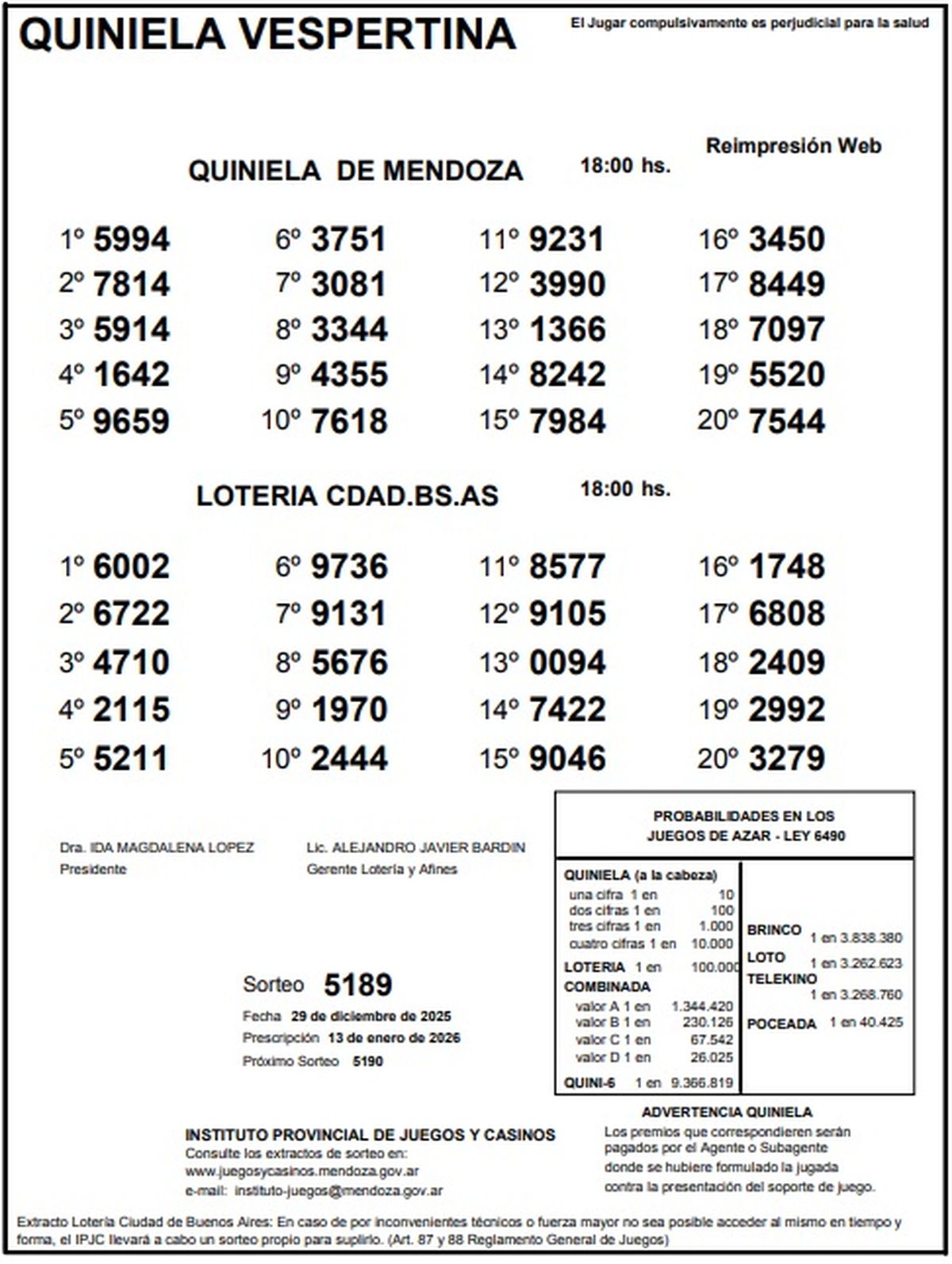 Resultados Quiniela de Mendoza: La Vespertina del 29 de diciembre de 2025