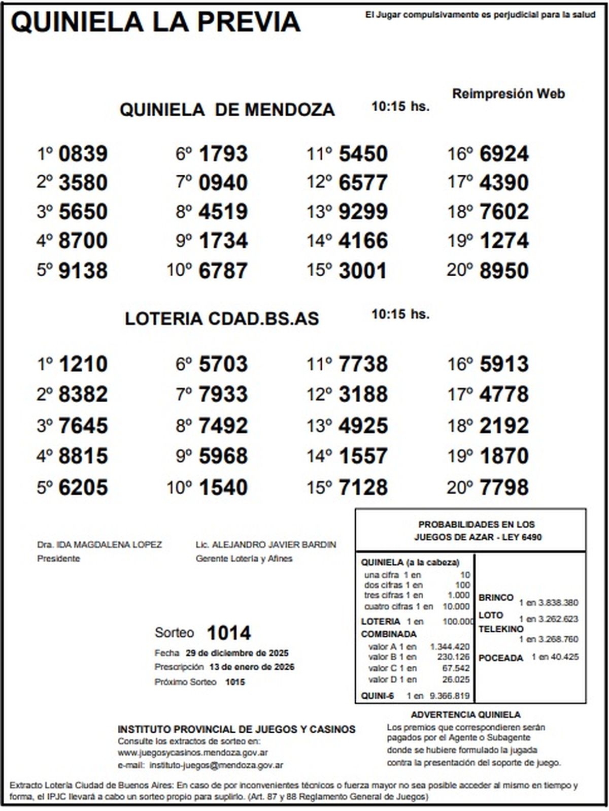 Resultados Quiniela de Mendoza: La Previa del 29 de diciembre de 2025