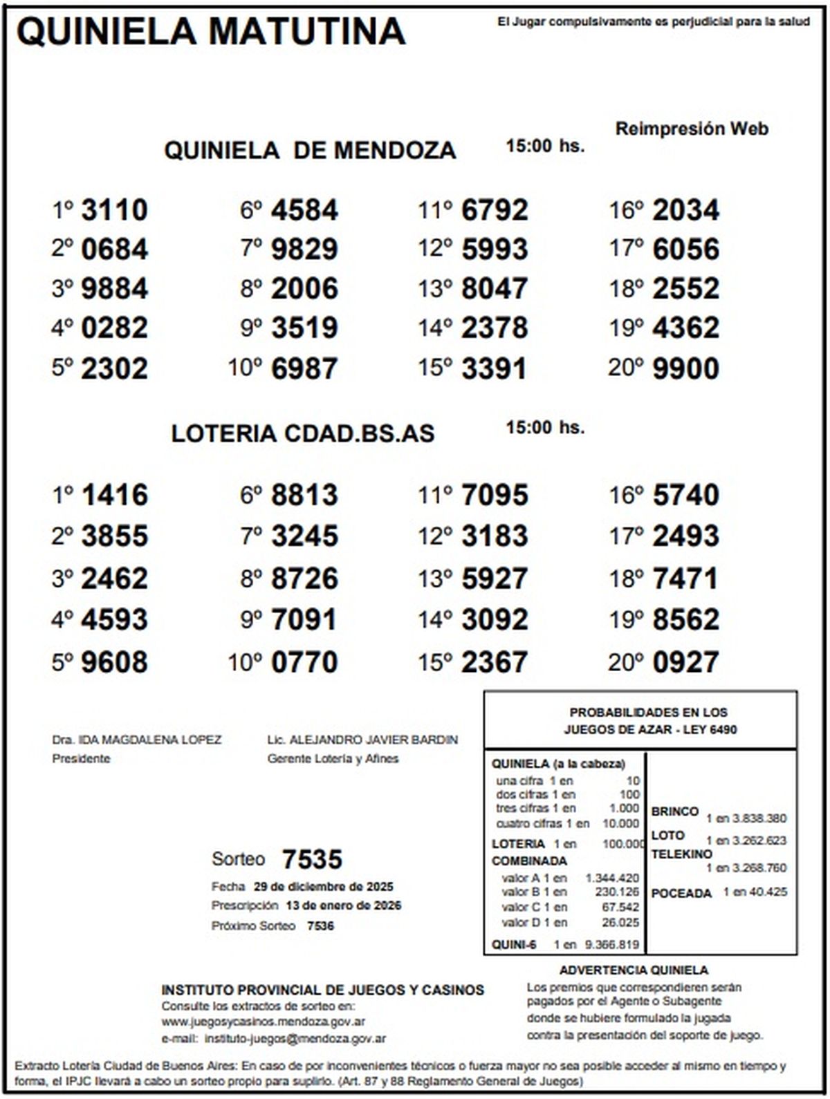 Resultados Quiniela de Mendoza: La Matutina del 29 de diciembre de 2025