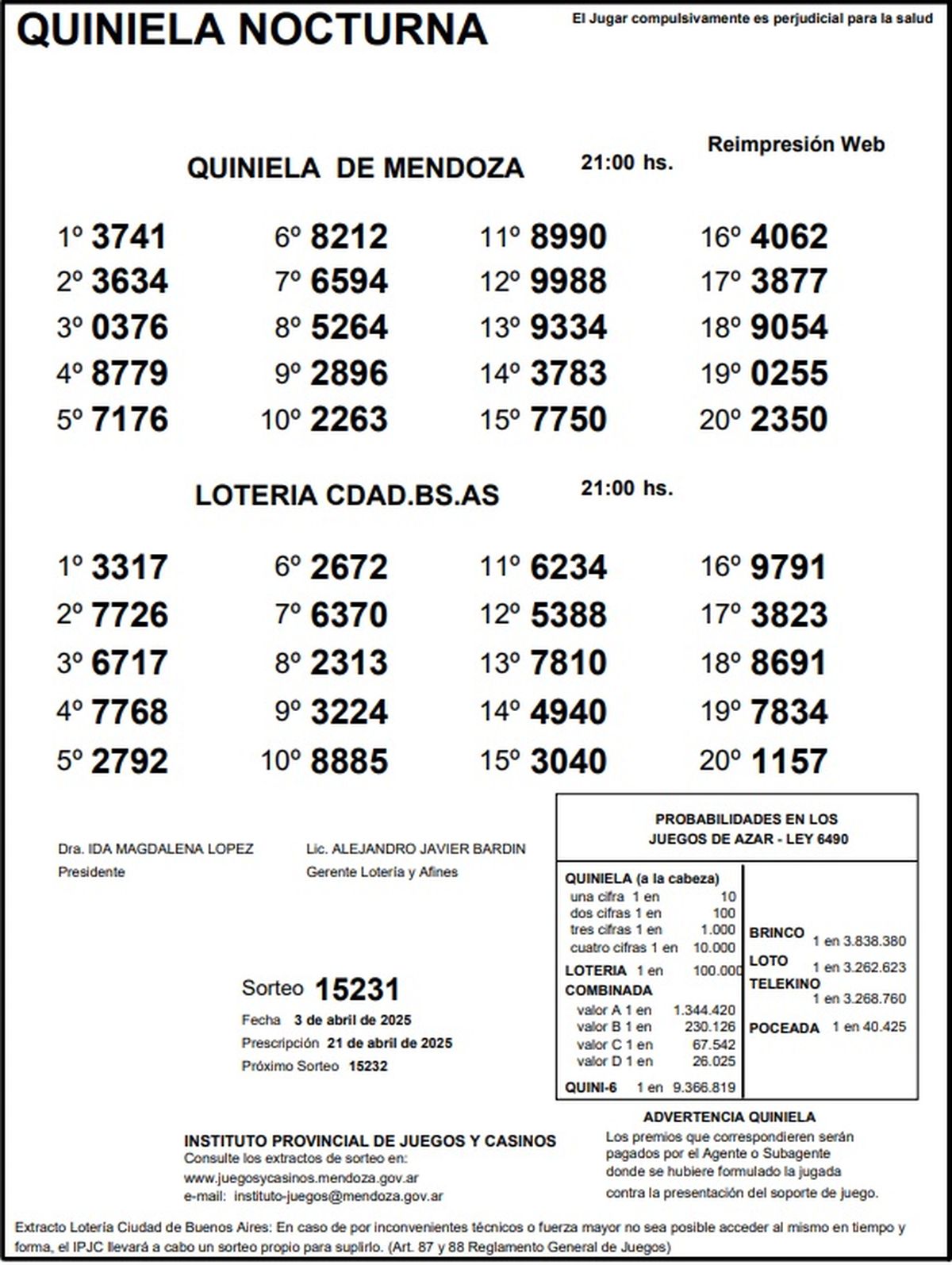 Quiniela de Mendoza: resultados de la Nocturna de hoy, 3 de abril de 2025