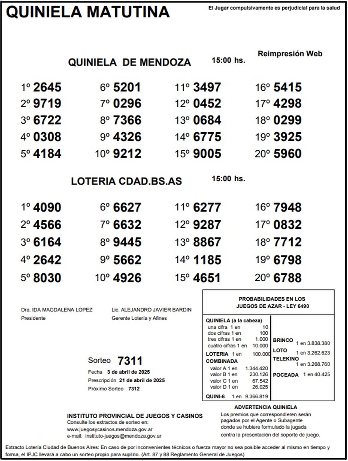 Resultados Quiniela de Mendoza: La Matutina del 3 de abril de 2025