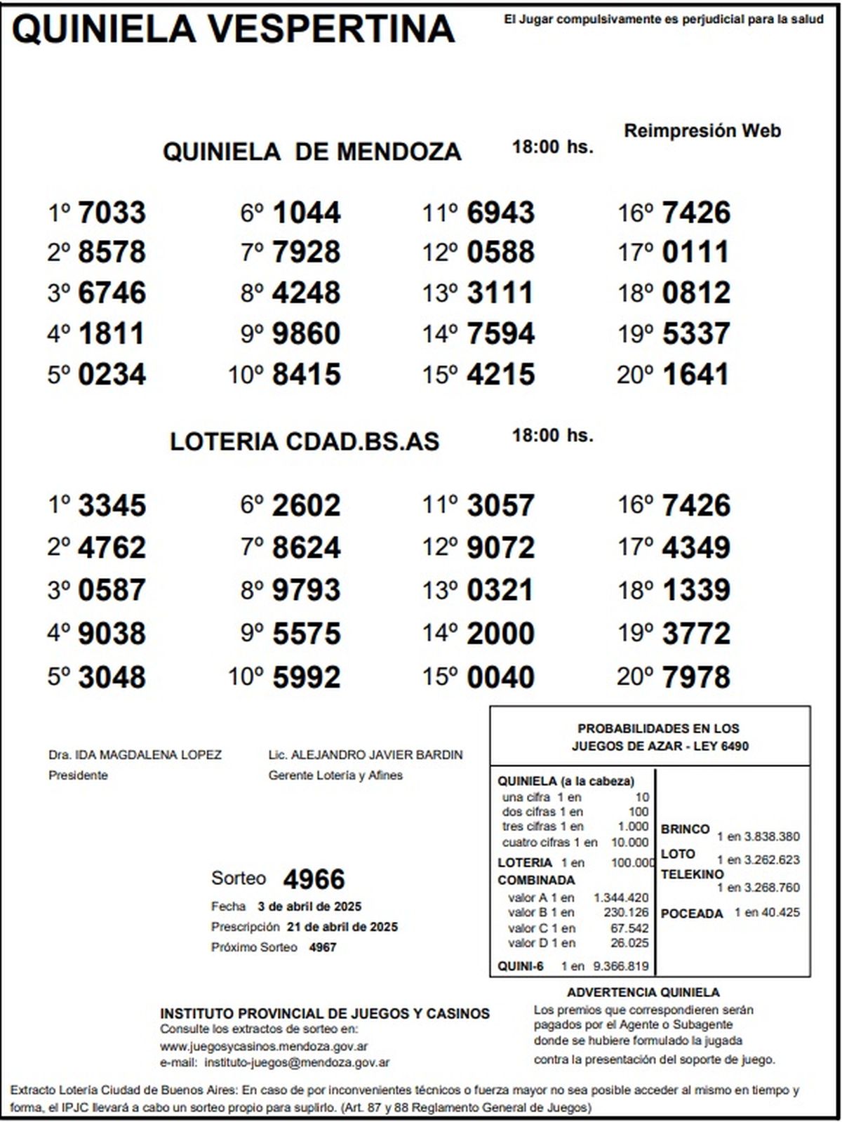 Resultados Quiniela de Mendoza: La Vespertina del 3 de abril de 2025