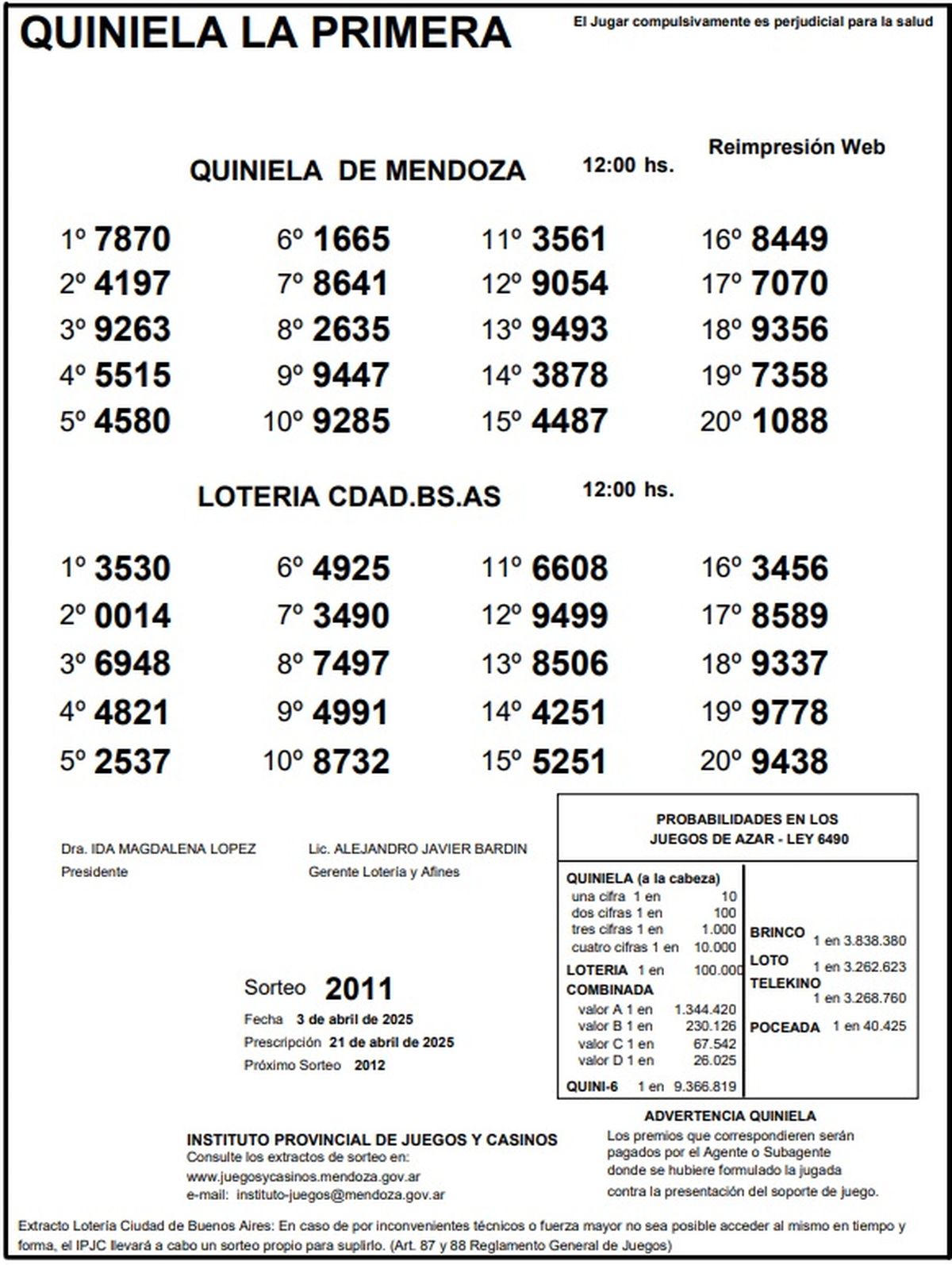 Resultados Quiniela de Mendoza: La Primera del 3 de abril de 2025