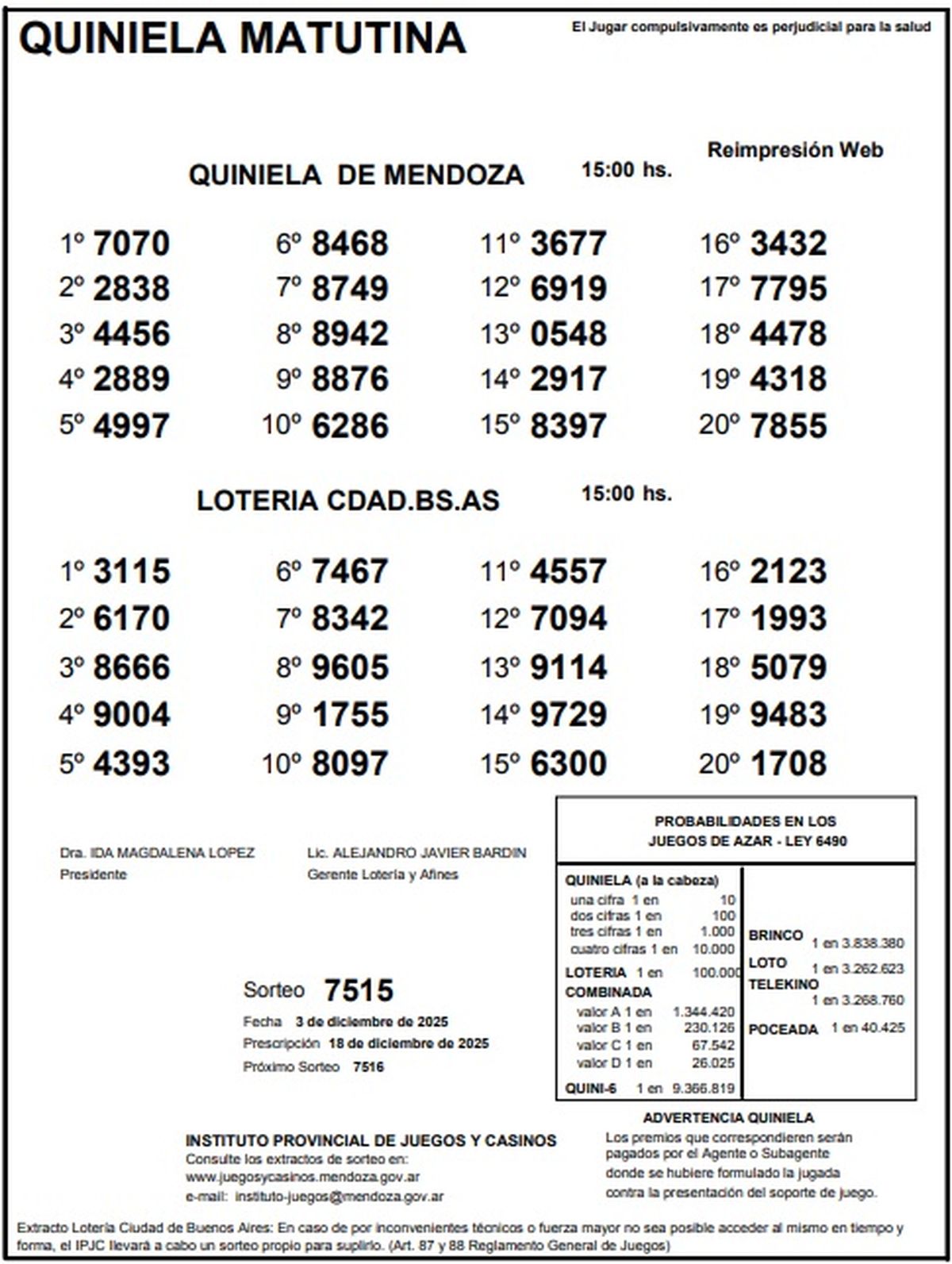 Resultados Quiniela de Mendoza: La Matutina del 3 de diciembre de 2025