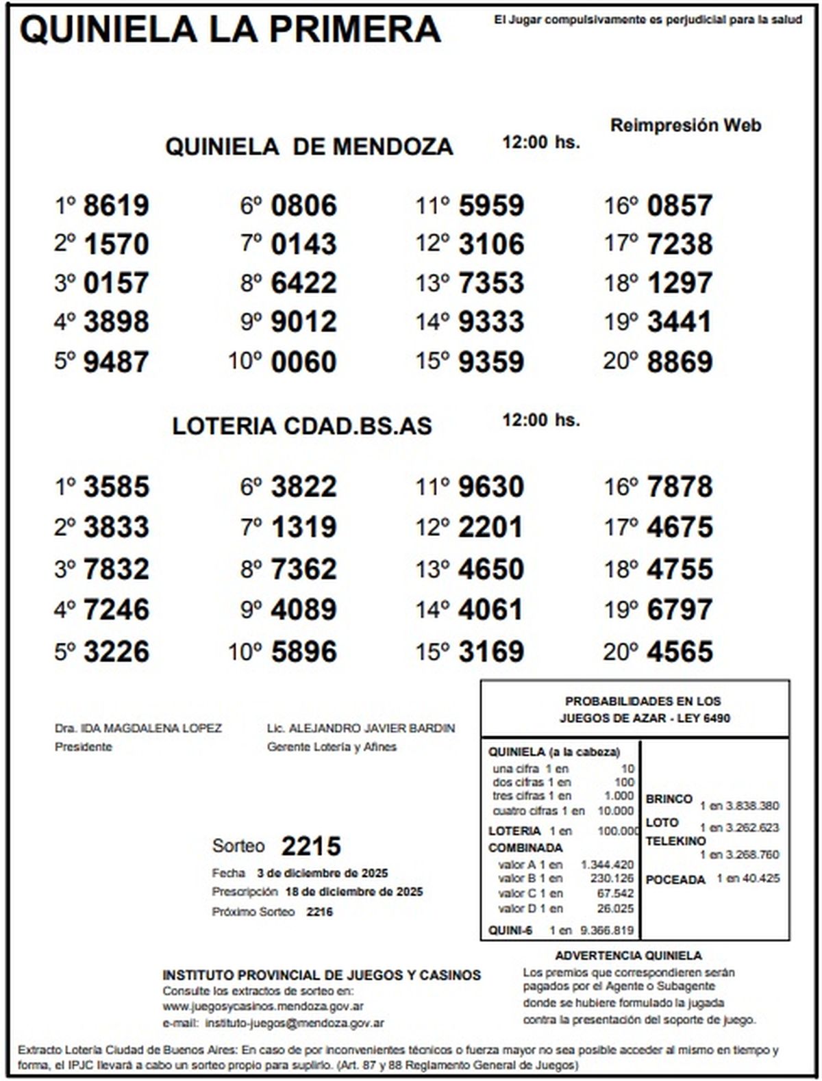 Resultados Quiniela de Mendoza: La Primera del 3 de diciembre de 2025