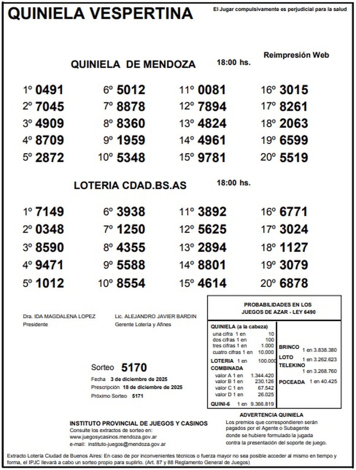 Resultados Quiniela de Mendoza: La Vespertina del 3 de diciembre de 2025