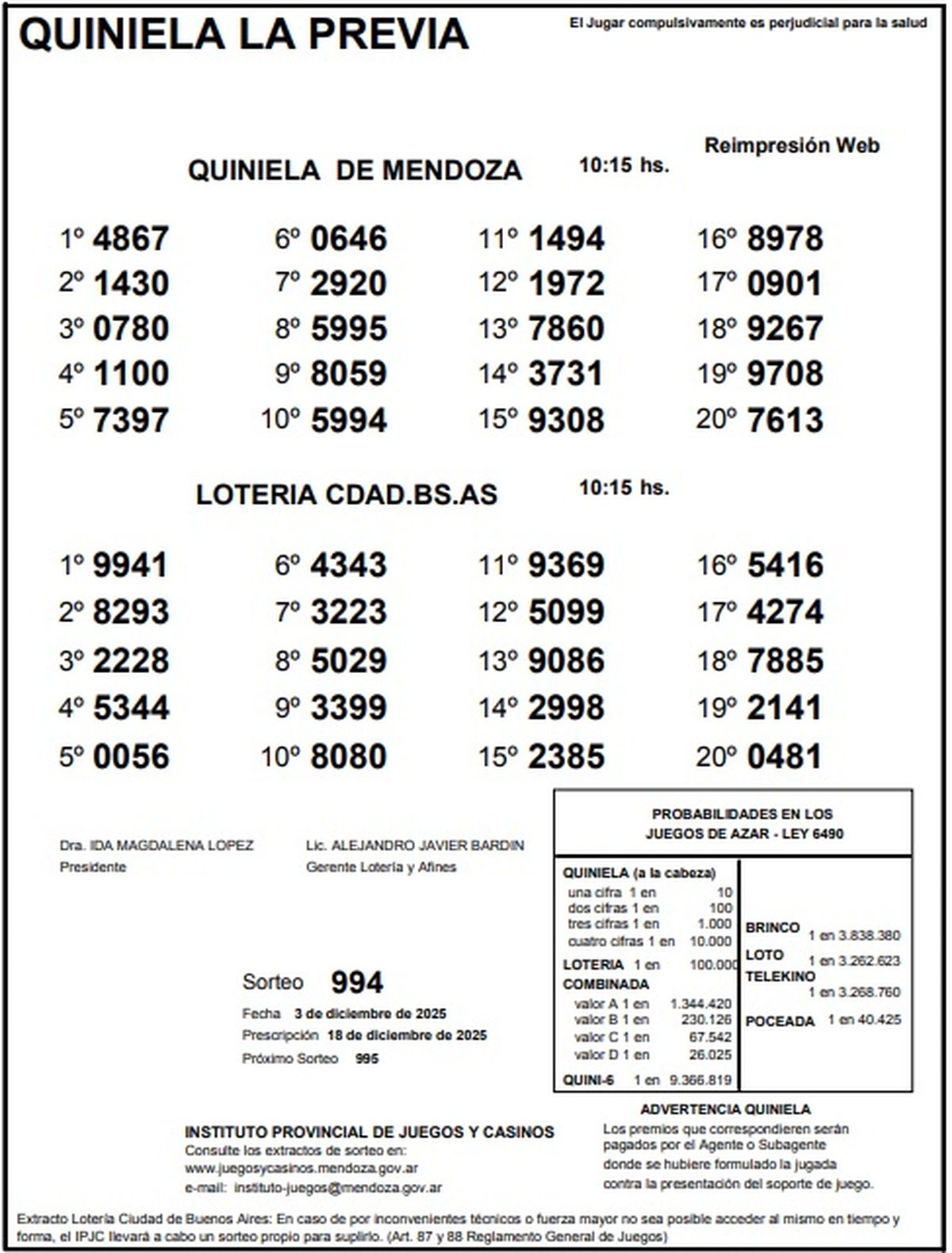 Resultados Quiniela de Mendoza: La Previa del 3 de diciembre de 2025
