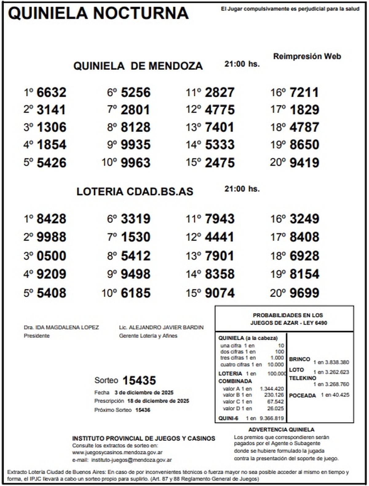 Quiniela de Mendoza: resultados de la Nocturna de hoy, 3 de diciembre de 2025