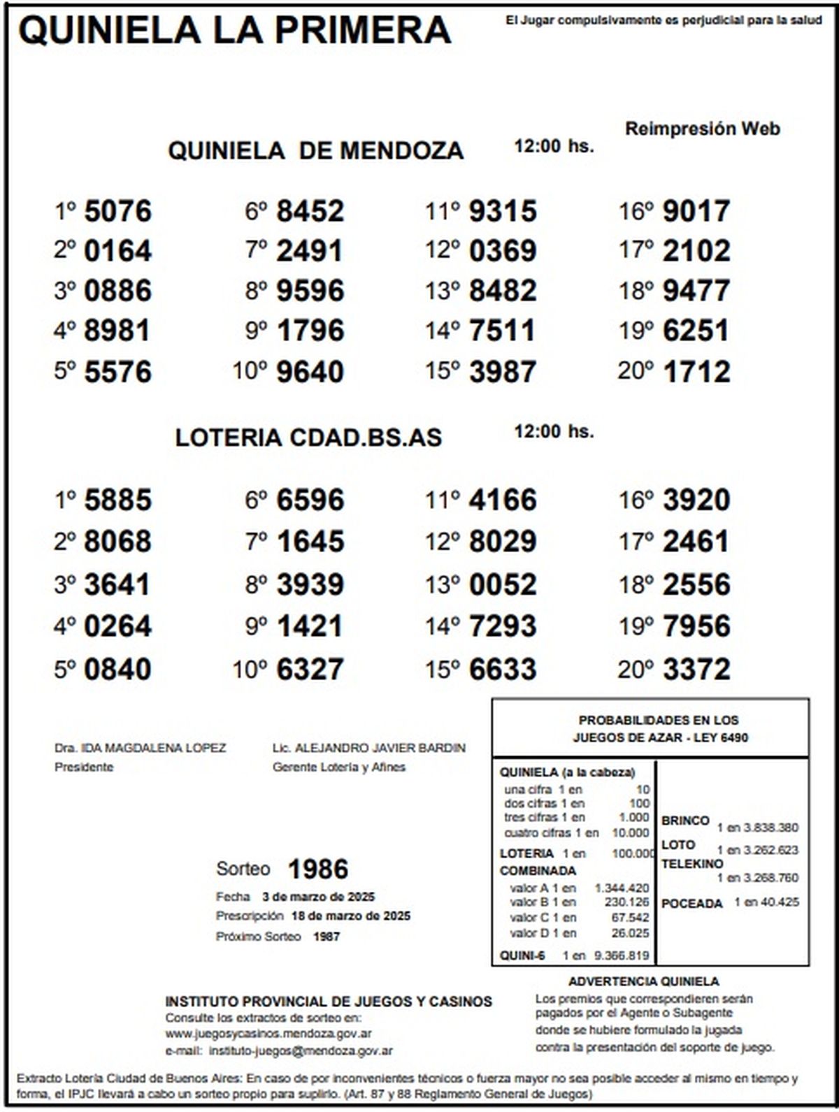 Resultados Quiniela de Mendoza: La Primera del 3 de marzo de 2025
