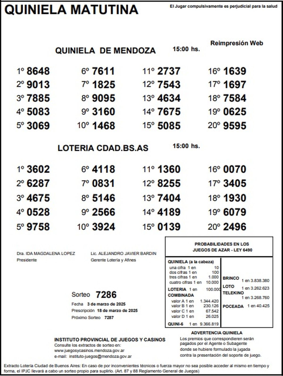 Resultados Quiniela de Mendoza: La Matutina del 3 de marzo de 2025