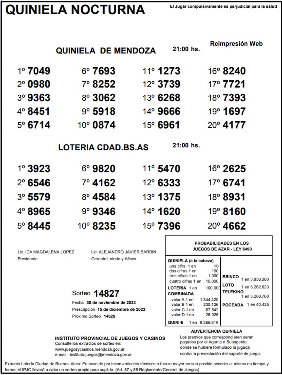 Quiniela de Mendoza: resultados de la Nocturna de hoy, 30 de noviembre de 2023