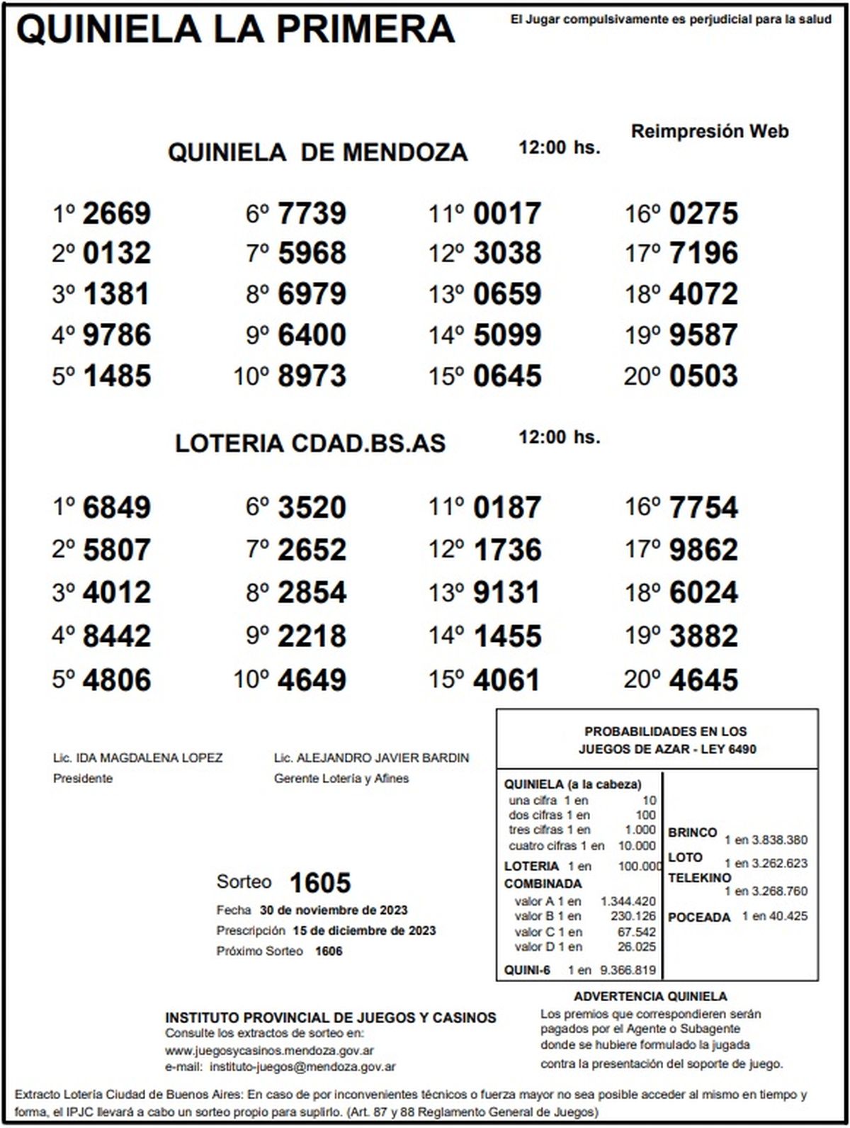 Resultados Quiniela de Mendoza: La Primera del 30 de noviembre 2023