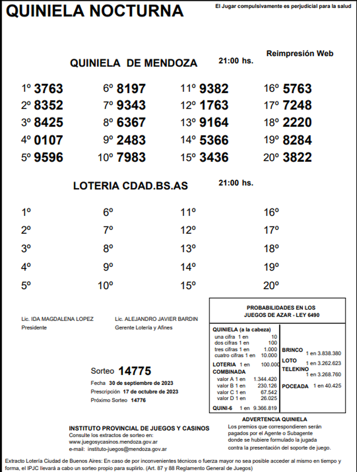 Quiniela de Mendoza: resultados de la Nocturna de hoy, 30 de setiembre de 2023