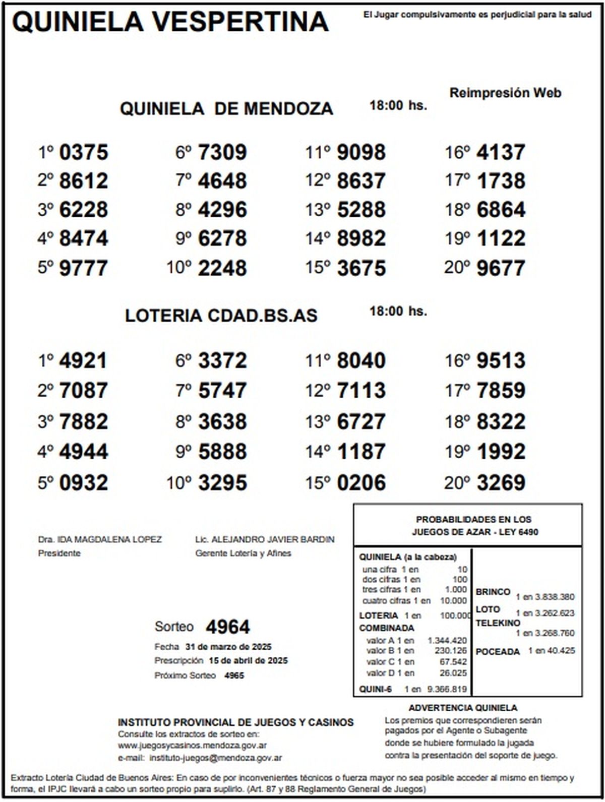 Resultados Quiniela de Mendoza: La Vespertina del 31 de marzo de 2025