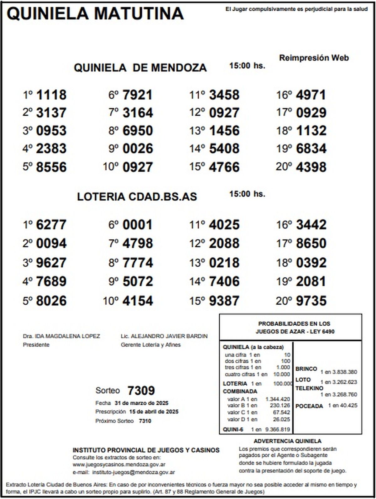 Resultados Quiniela de Mendoza: La Matutina del 31 de marzo de 2025