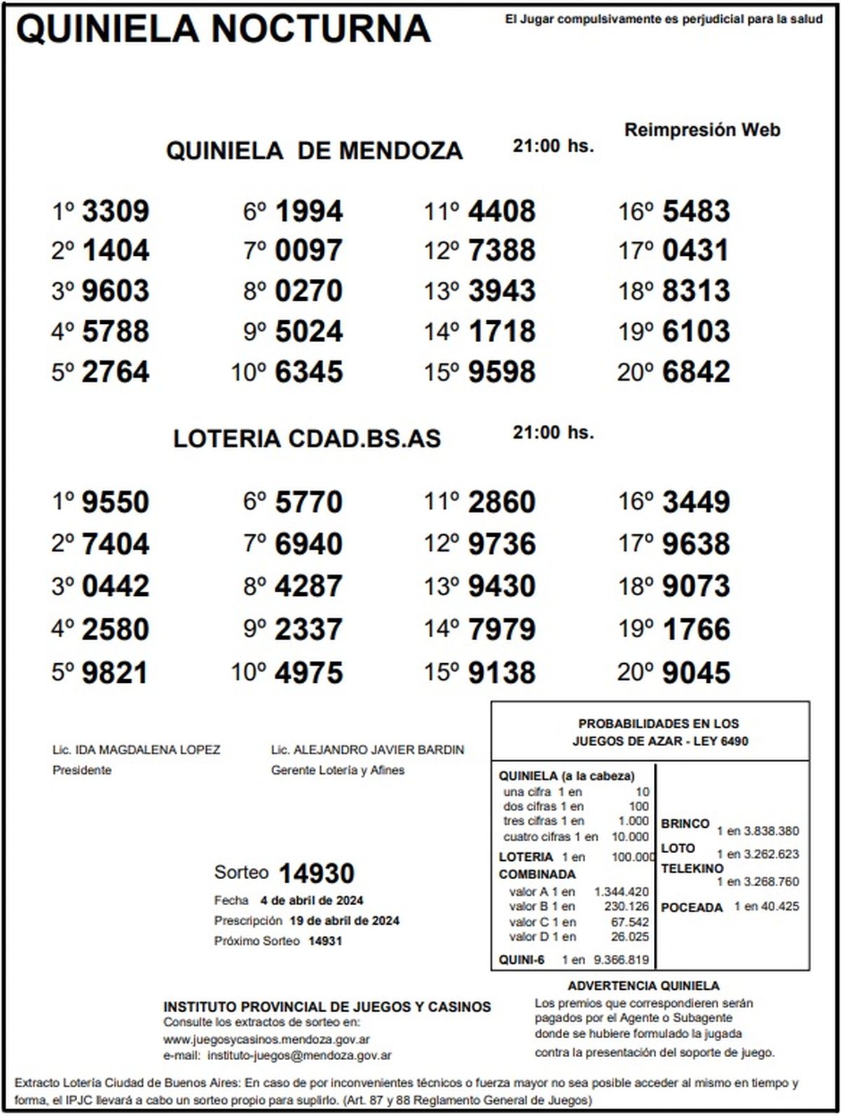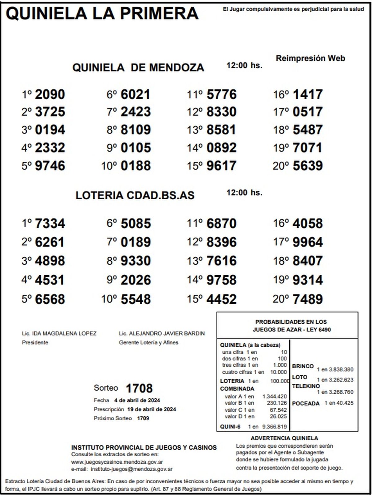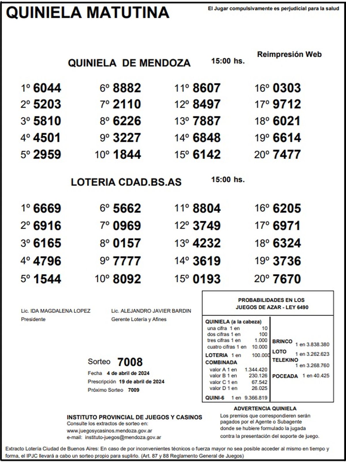 Quiniela de Mendoza: resultados de la Nocturna de hoy, 4 de abril de 2024