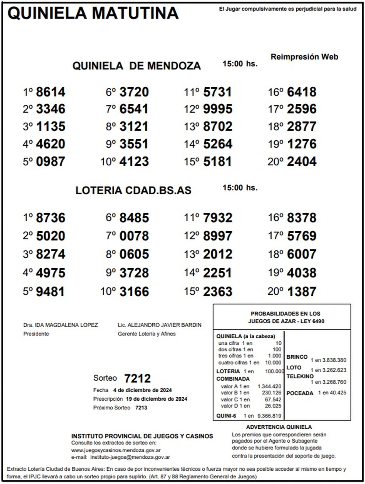 Resultados Quiniela de Mendoza: La Matutina del 4 de diciembre de 2024