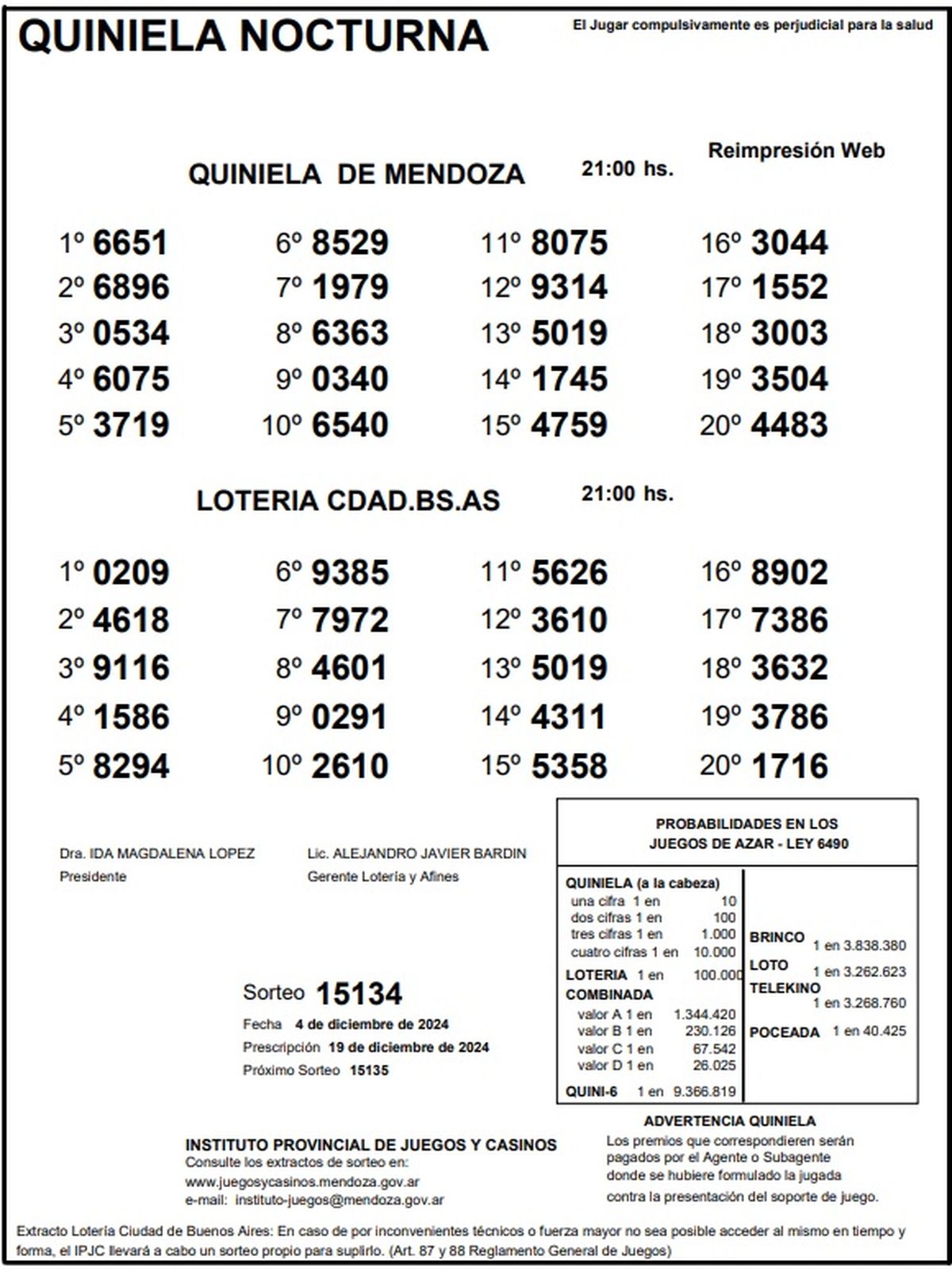 Quiniela de Mendoza: resultados de la Nocturna de hoy, 4 de diciembre de 2024