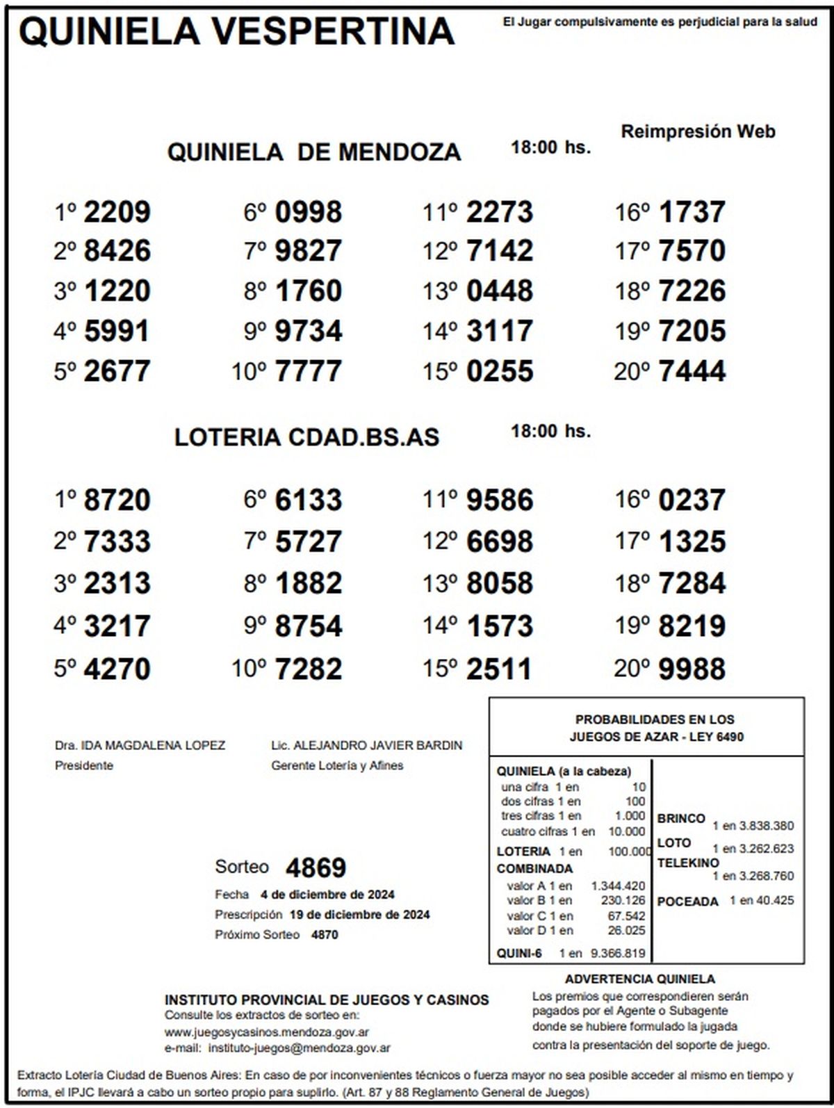 Resultados Quiniela de Mendoza: La Vespertina del 4 de diciembre de 2024
