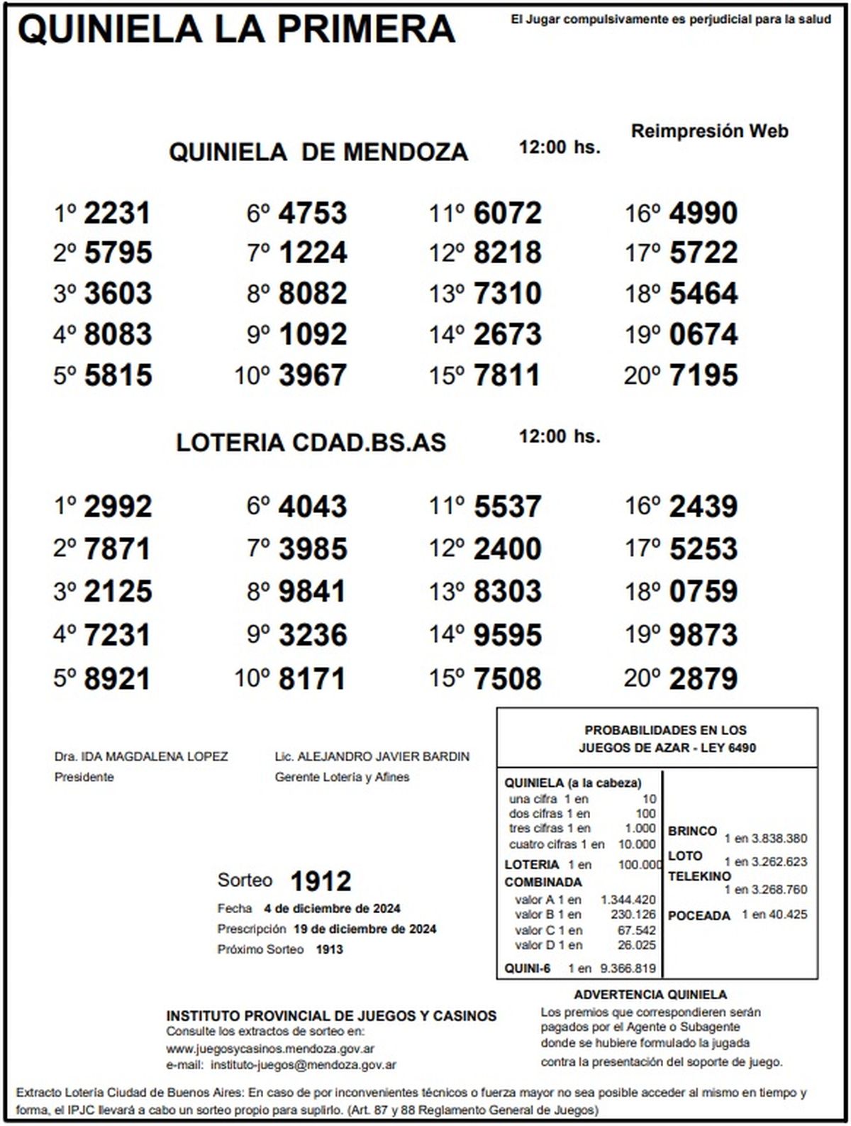 Resultados Quiniela de Mendoza: La Primera del 4 de diciembre de 2024