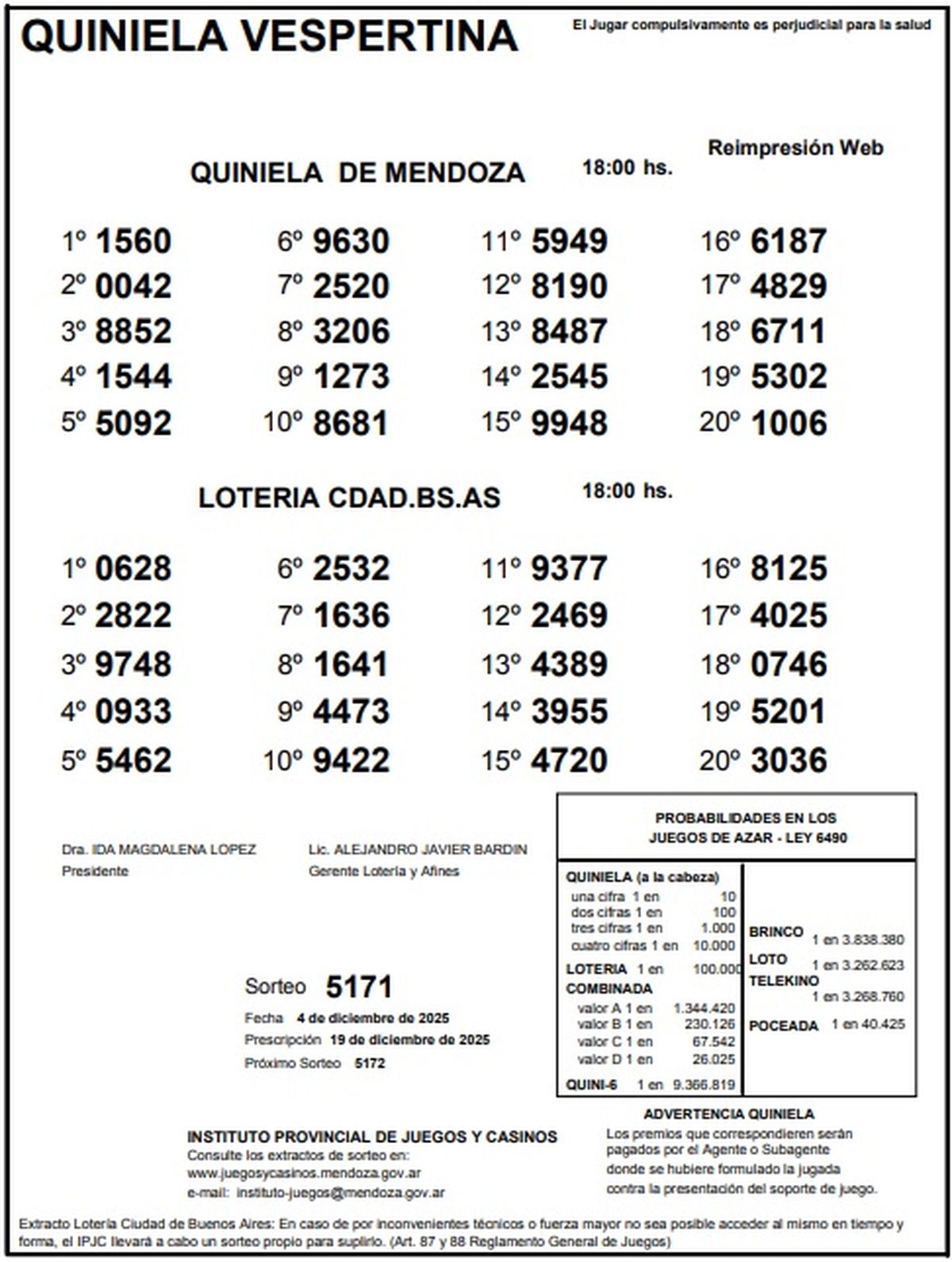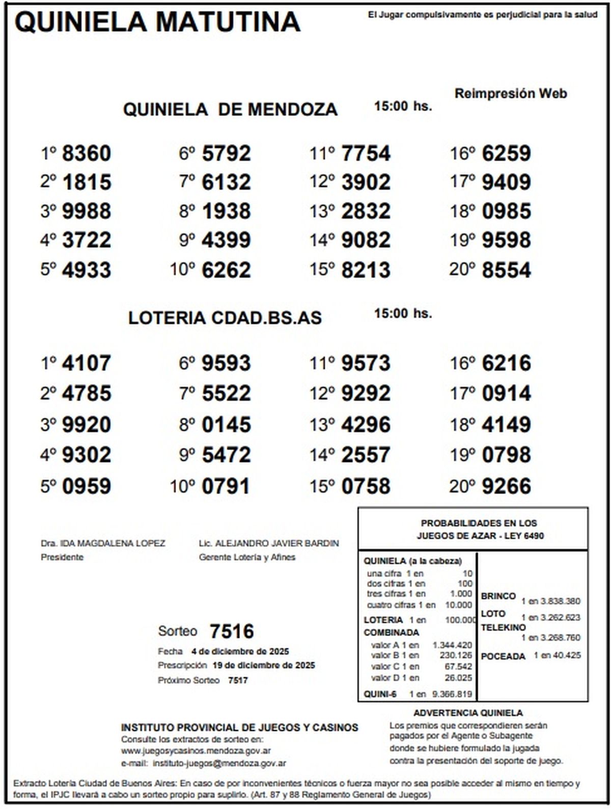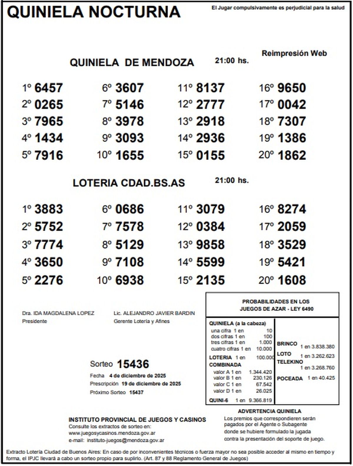 Quiniela de Mendoza: resultados de la Nocturna de hoy, 4 de diciembre de 2025