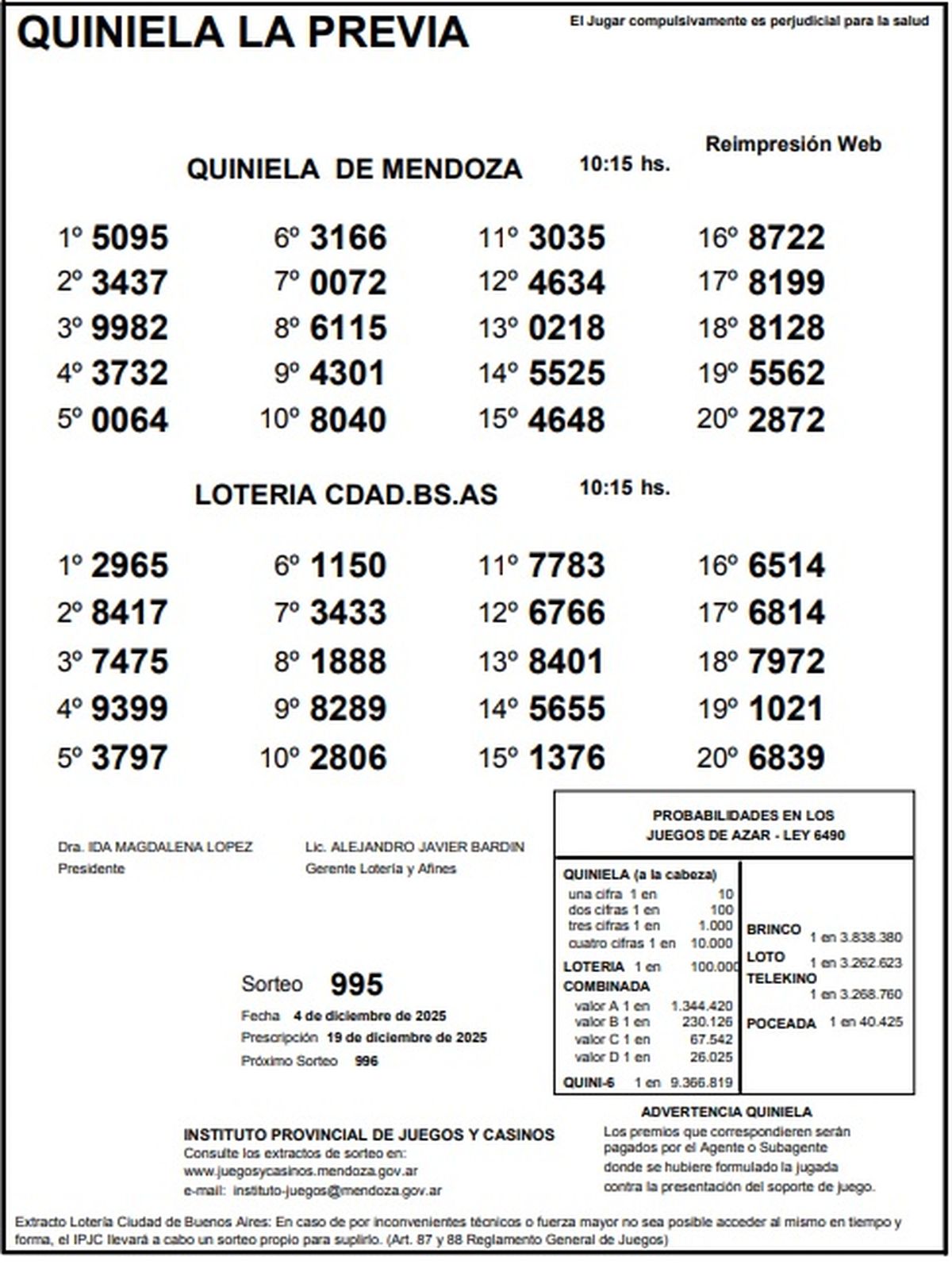 Resultados Quiniela de Mendoza: La Previa del 4 de diciembre de 2025
