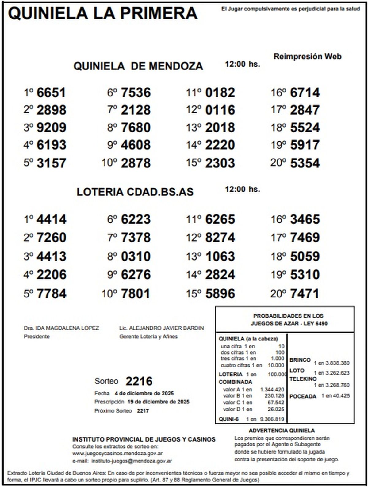 Resultados Quiniela de Mendoza: La Primera del 4 de diciembre de 2025