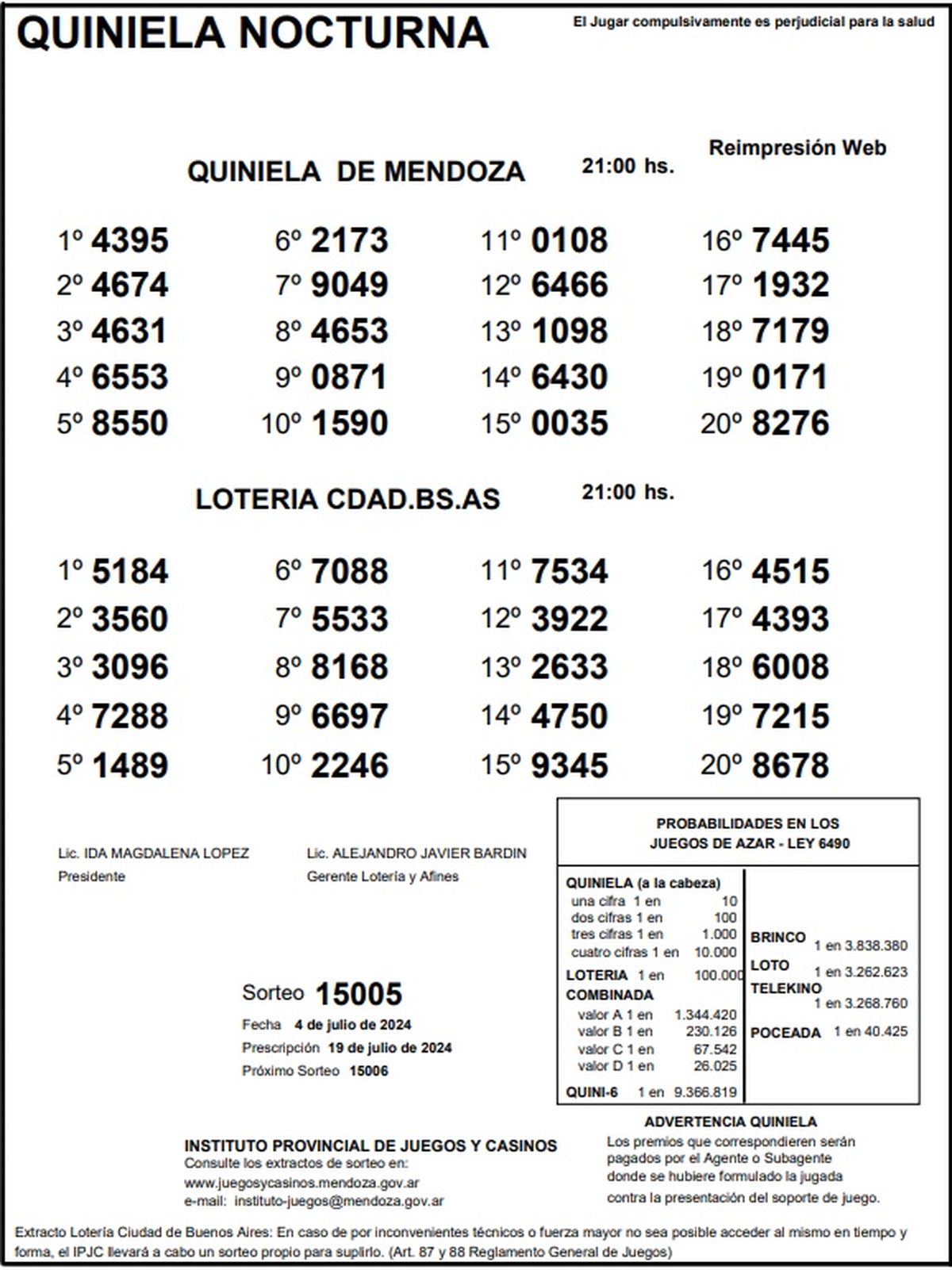 Este jueves 4 de julio se realizó el sorteo número 15005 de la Quiniela de Mendoza en su edición Nocturna y el número ganador resultó ser el 4395. Mientras que en el segundo lugar salió el 4674 y en el tercer lugar el 4631.