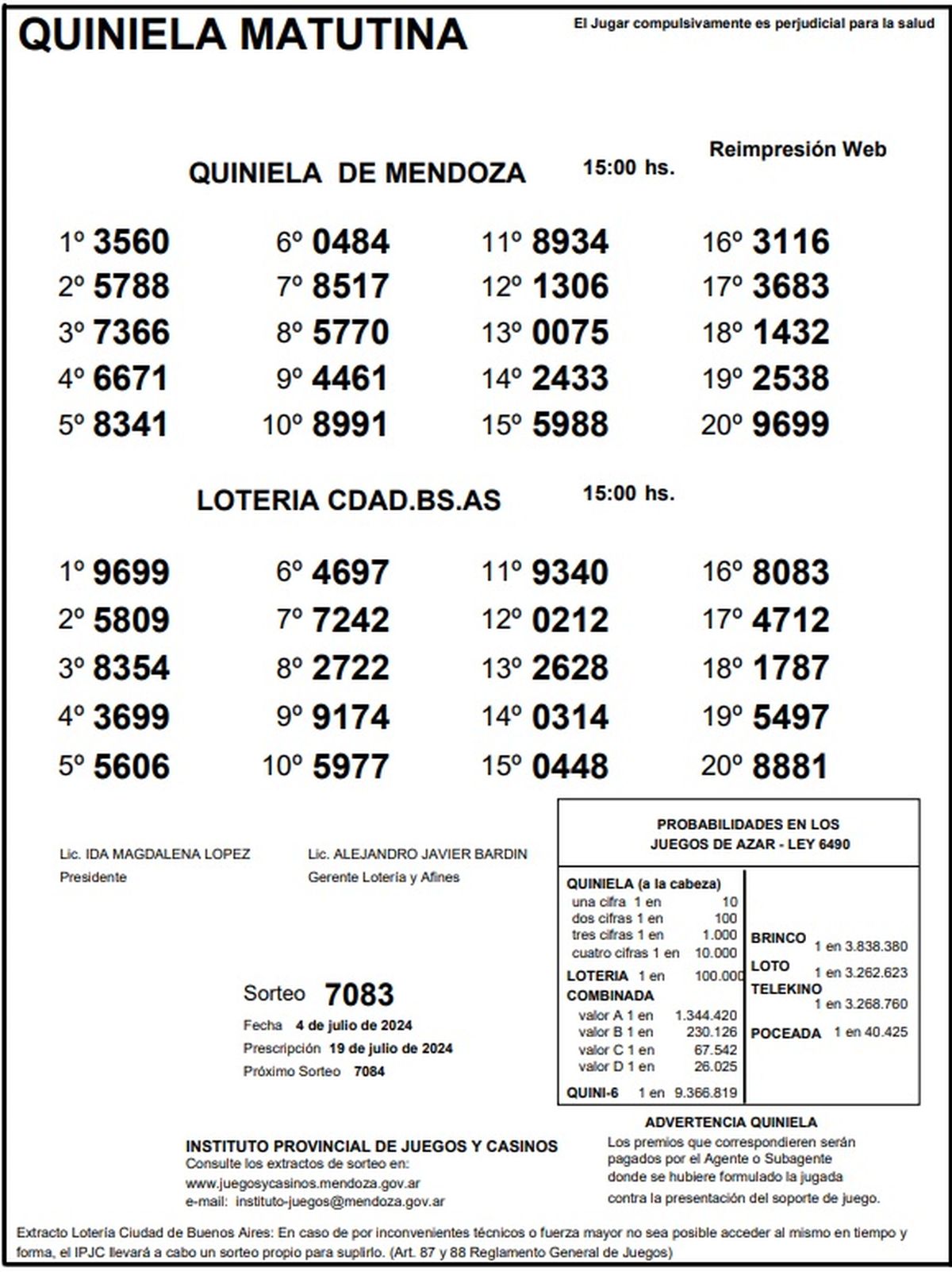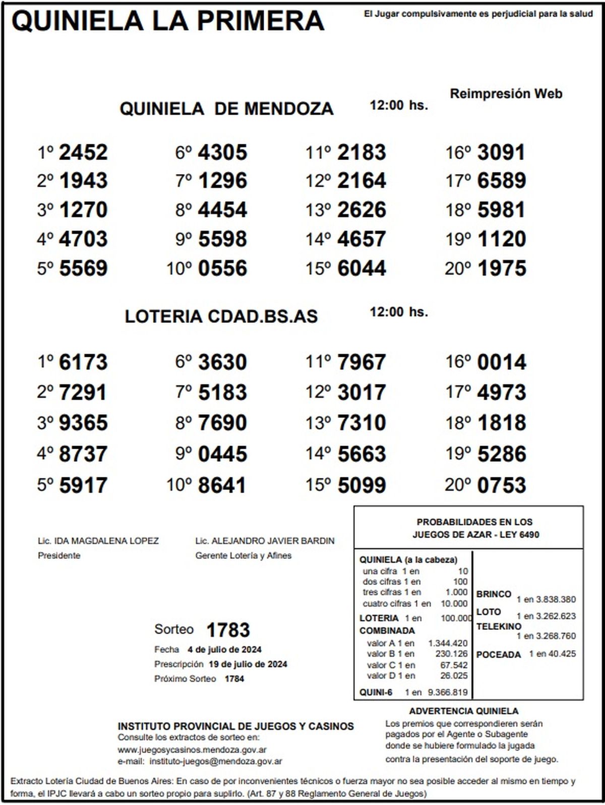 Resultados Quiniela de Mendoza: La Primera del 4 de julio 2024
