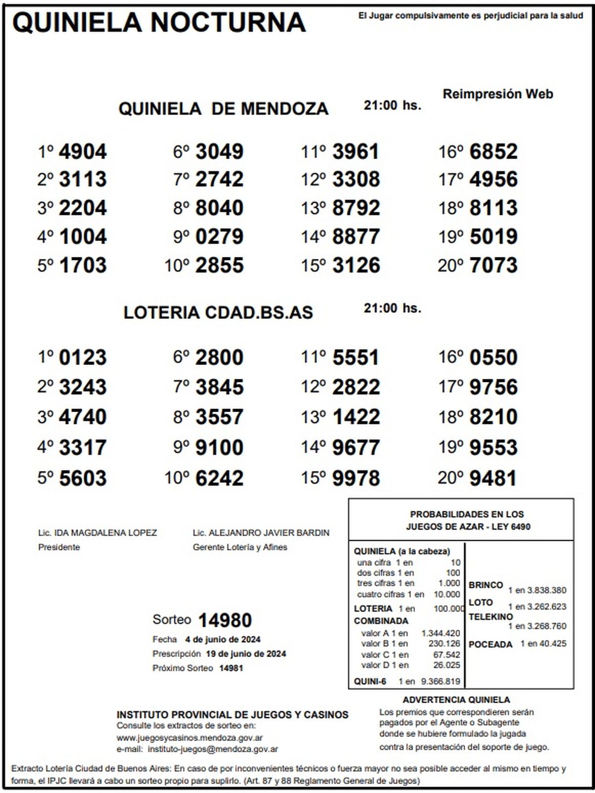 Este martes 4 de junio se realizó el sorteo de la Quiniela de Mendoza en su edición Nocturna y el primer premio fue para el número 4904