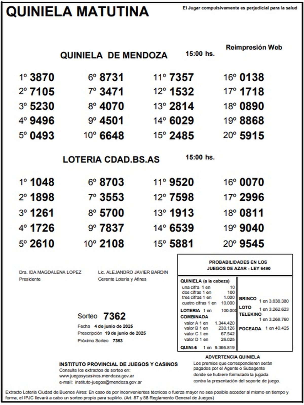 Resultados Quiniela de Mendoza: La Matutina del 4 de junio de 2025