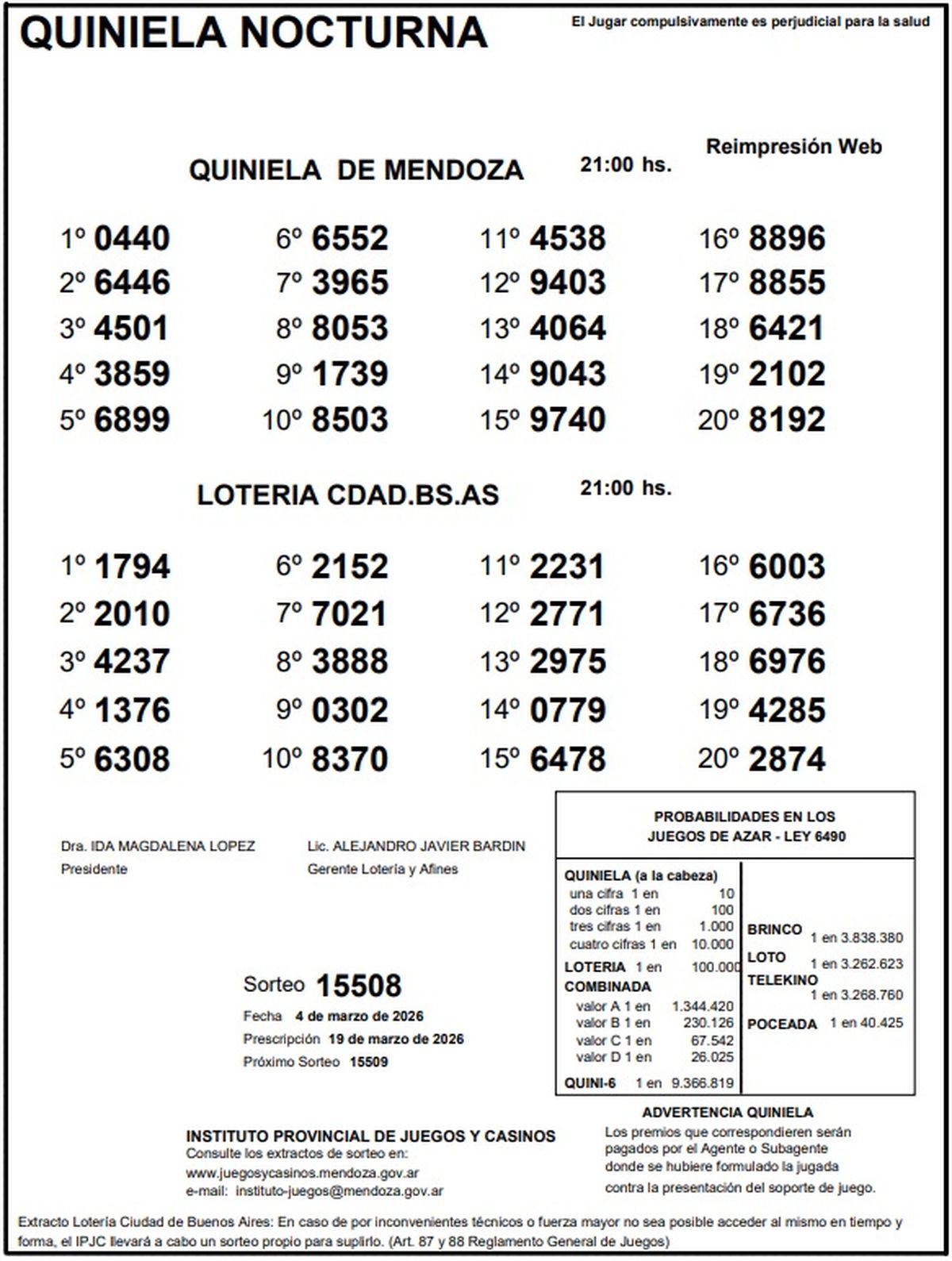 Quiniela de Mendoza: resultados de la Nocturna de hoy, 4 de marzo de 2026