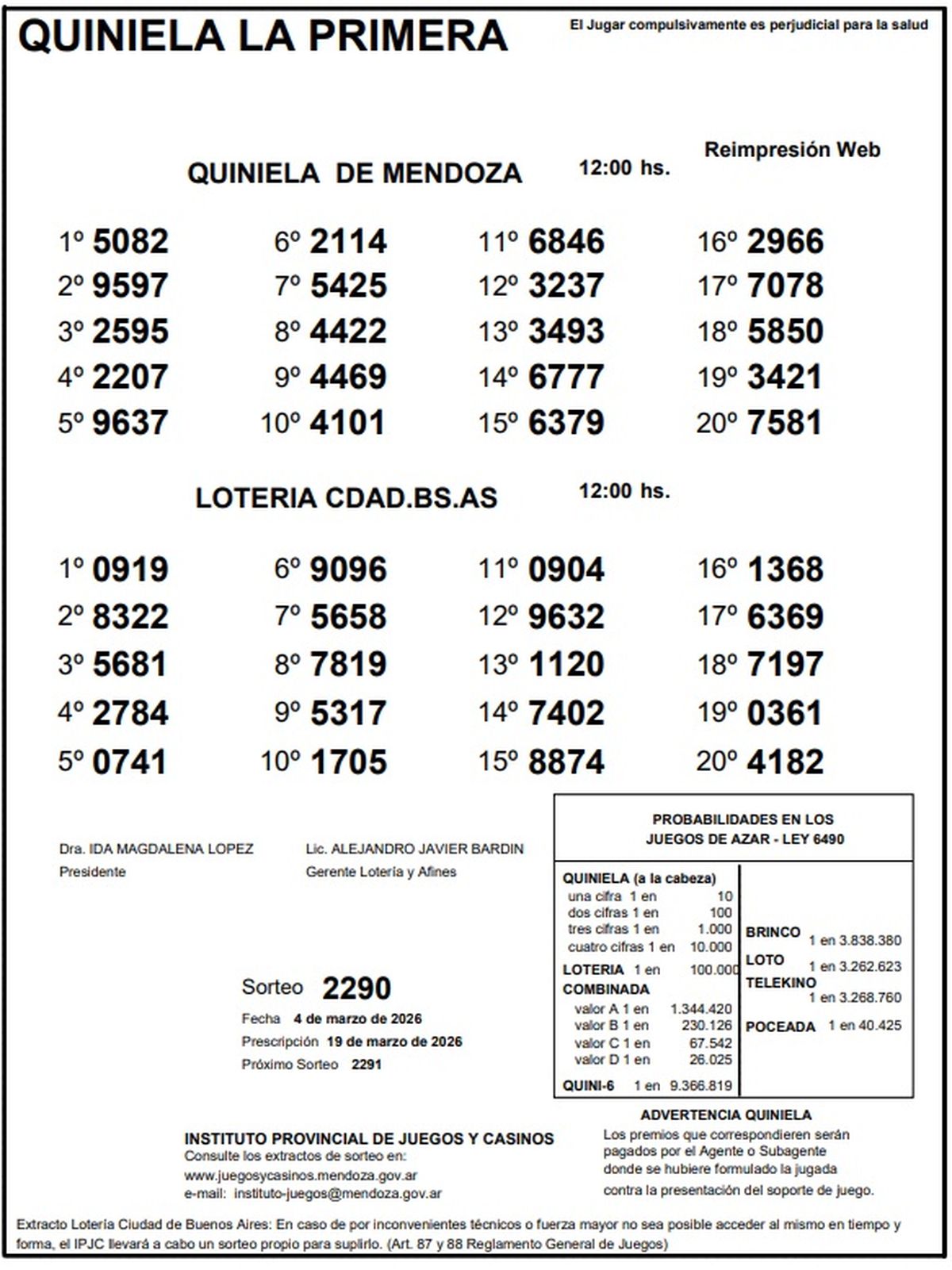 Resultados Quiniela de Mendoza: La Primera del 4 de marzo de 2026