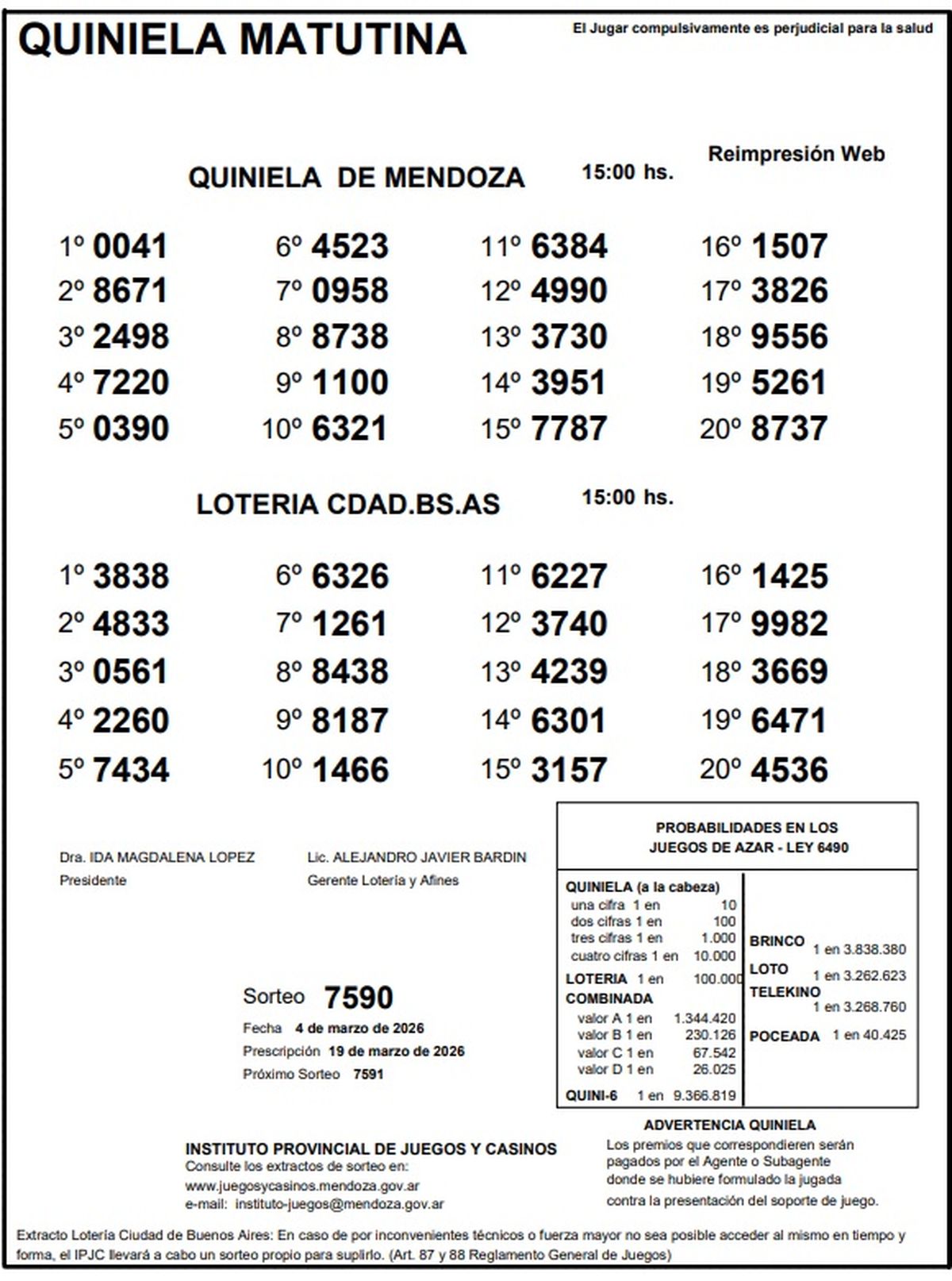 Resultados Quiniela de Mendoza: La Matutina del 4 de marzo de 2026
