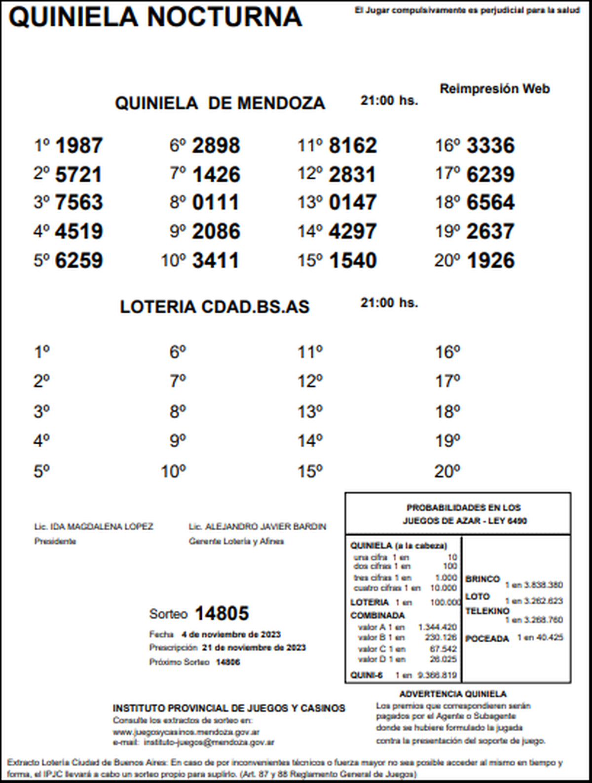 Este sábado 4 de noviembre se realizó el sorteo número 14805 de la Quiniela de Mendoza en su edición Nocturna y el número ganador resultó ser el 1987. Mientras que en el segundo lugar salió el 5721 y en el tercer lugar el 7563.