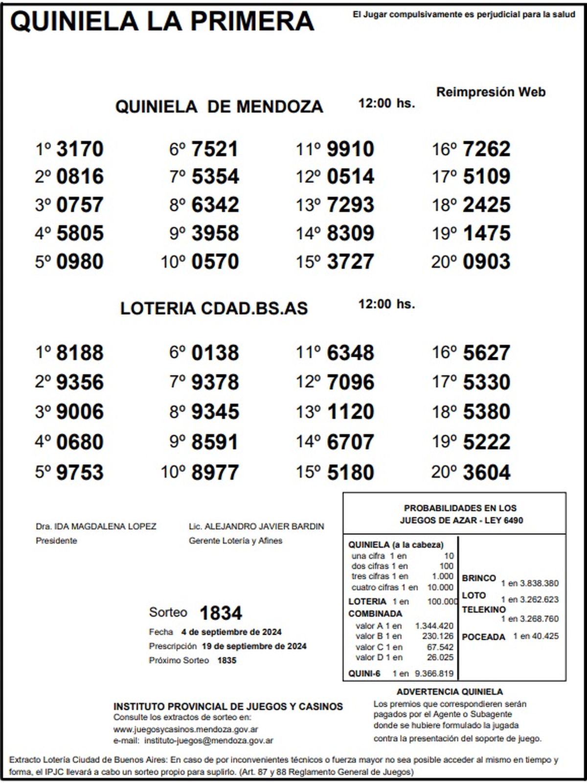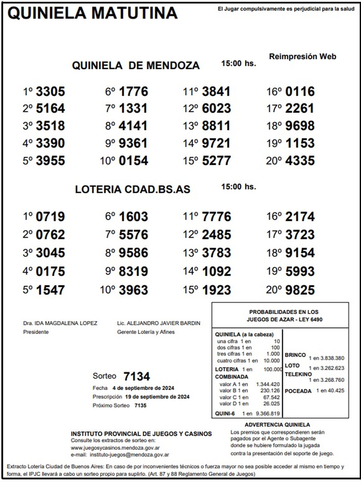 Resultados Quiniela de Mendoza: La Primera del 4 de setiembre 2024