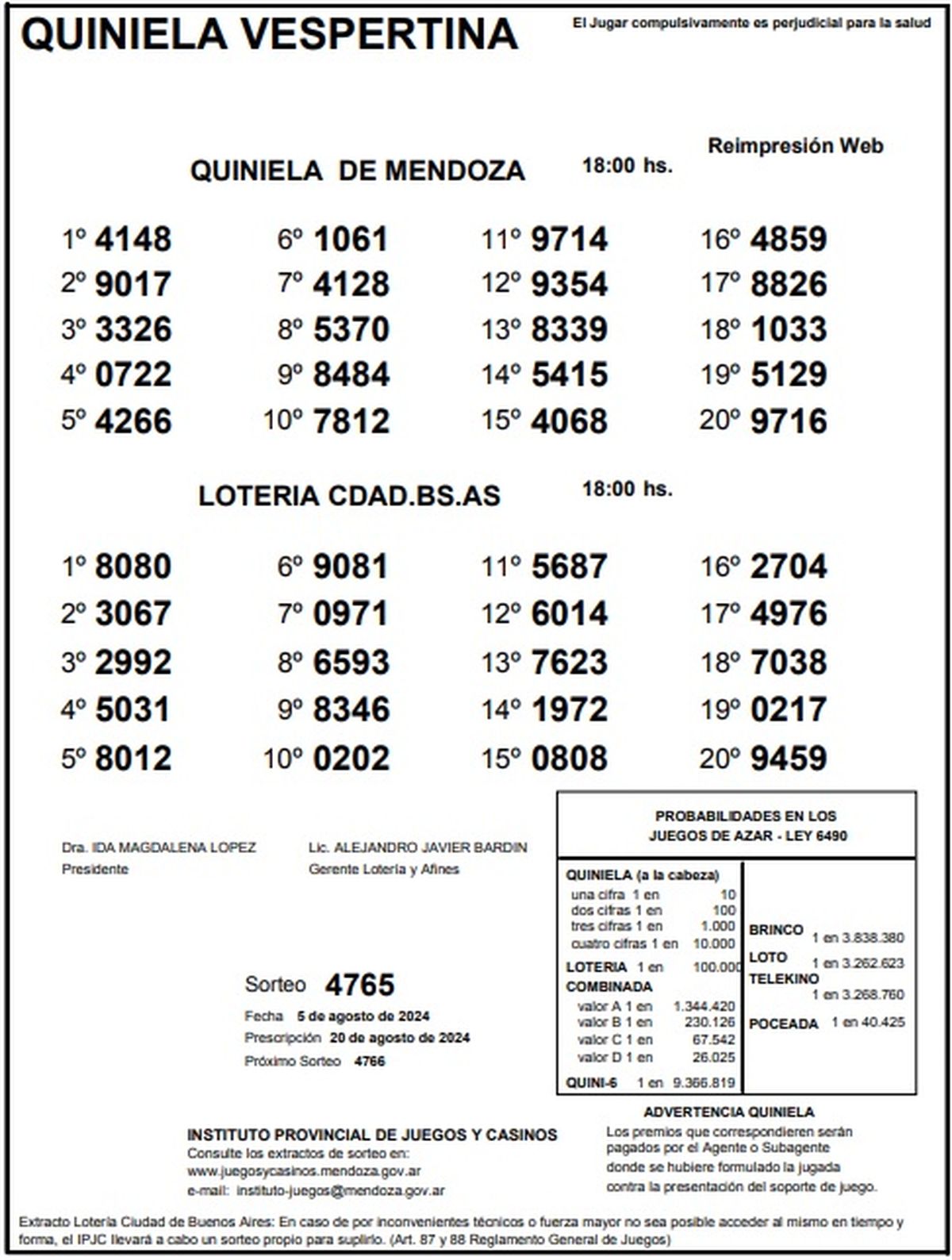 Resultados Quiniela de Mendoza: La Vespertina del 5 de agosto 2024