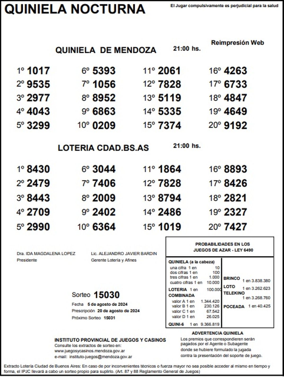 Quiniela de Mendoza: resultados de la Nocturna de hoy, 5 de agosto de 2024