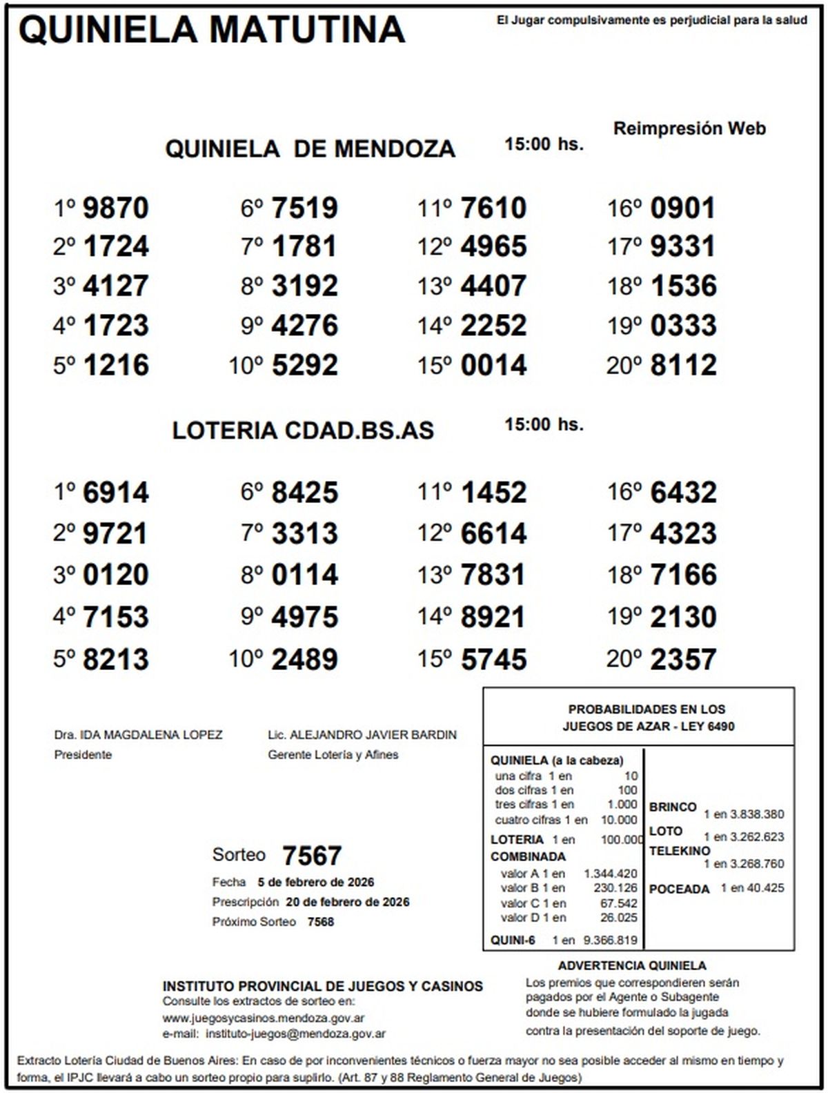 Resultados Quiniela de Mendoza: La Matutina del 5 de febrero de 2026