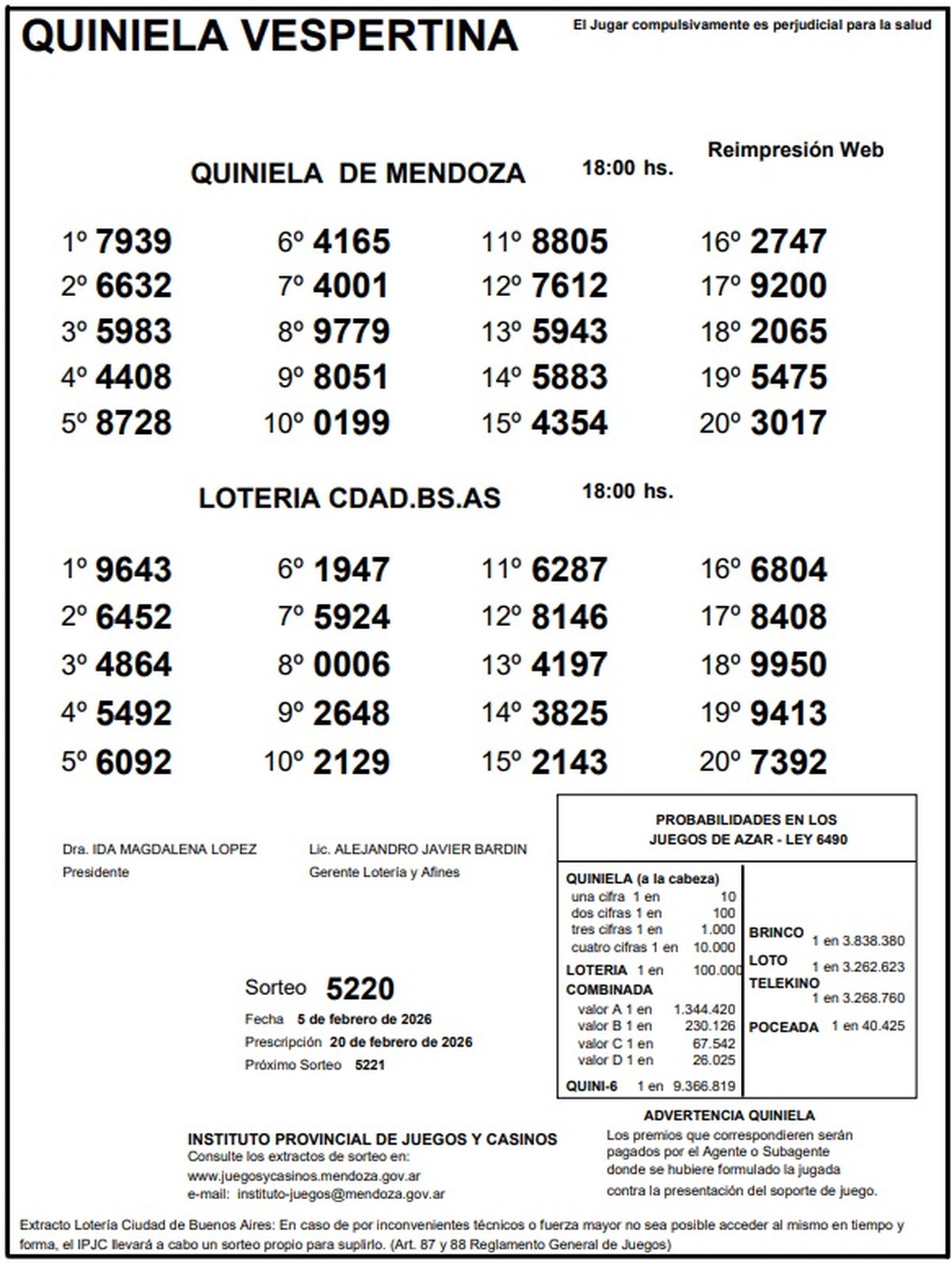 Resultados Quiniela de Mendoza: La Vespertina del 5 de febrero de 2026