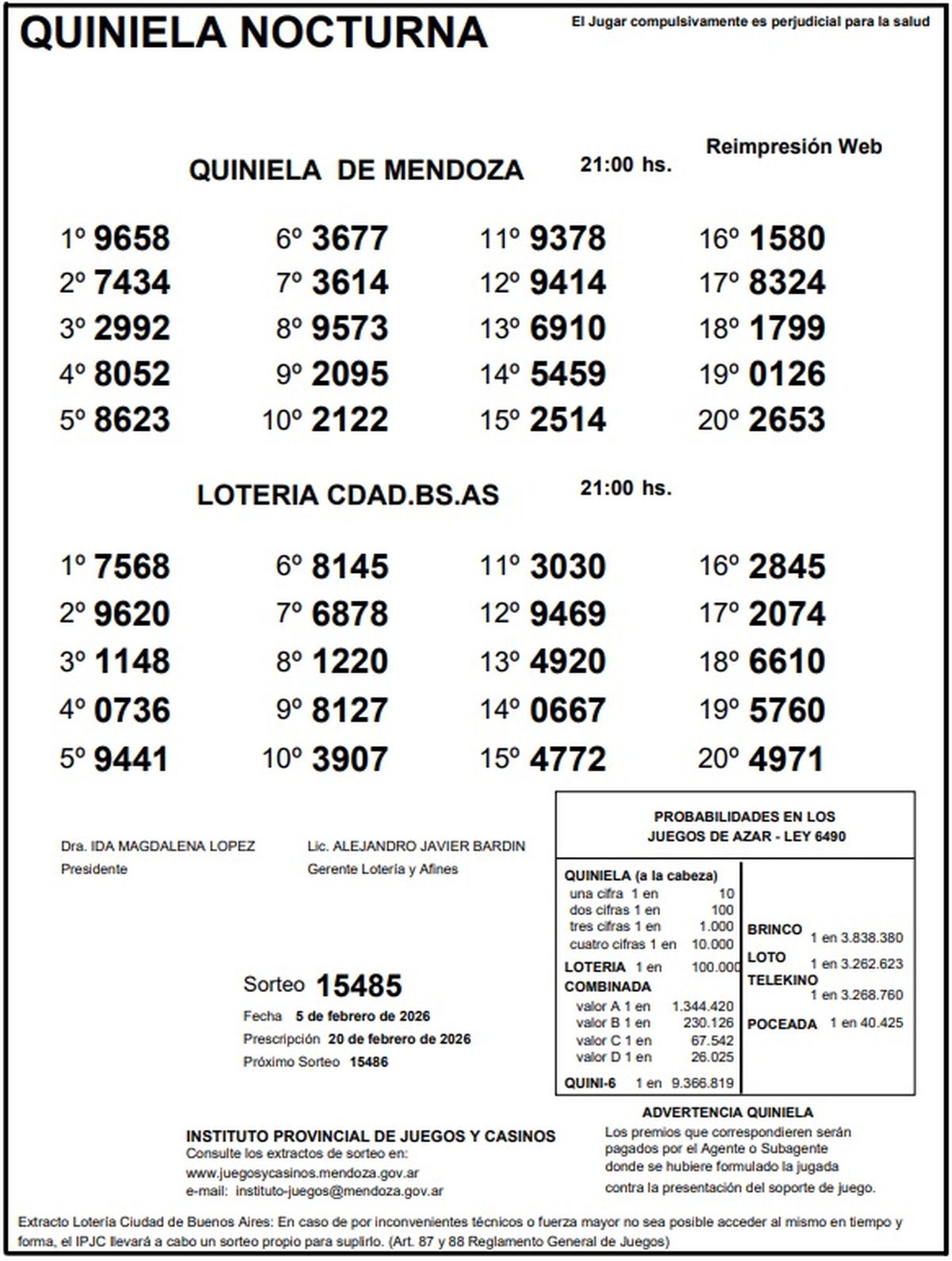Quiniela de Mendoza: resultados de la Nocturna de hoy, 5 de febrero de 2026