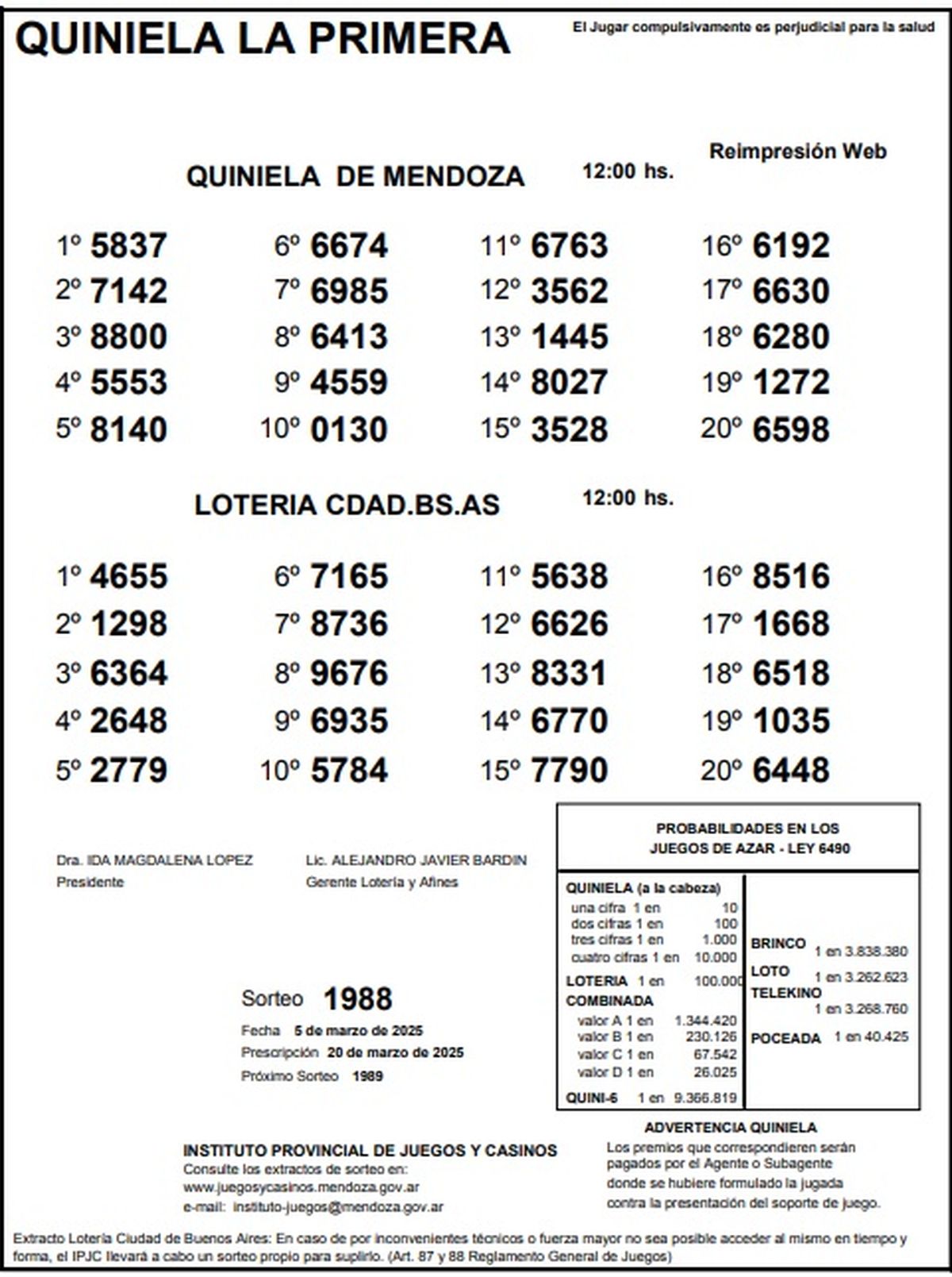 Resultados Quiniela de Mendoza: La Primera del 5 de marzo de 2025