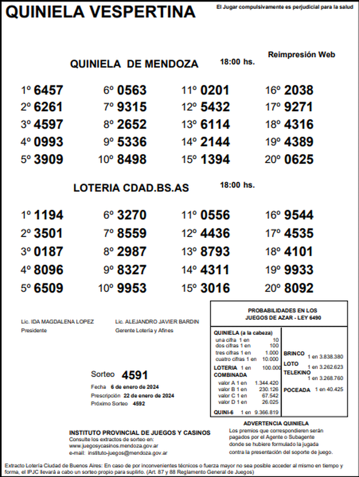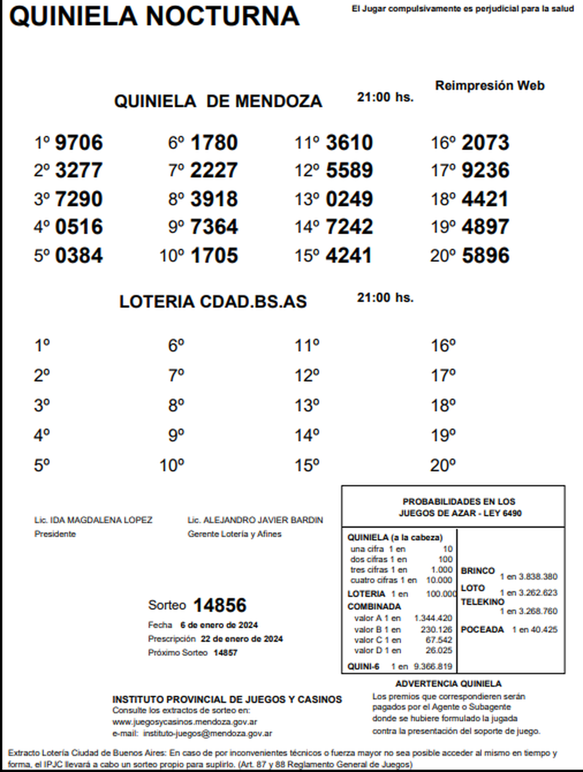 Quiniela de Mendoza: resultados de la Nocturna de hoy, 6 de enero